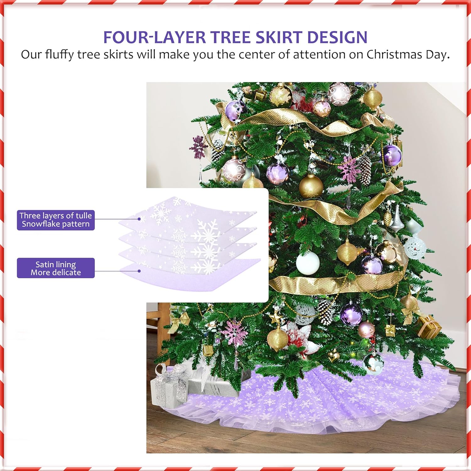 Christmas Wedding Tree Skirt, 4 Layer 45 in Snowflake Tulle Tree Decoration for Party Indoor, Fluffy Tree Cover Mat Ornament for Holiday, Purple