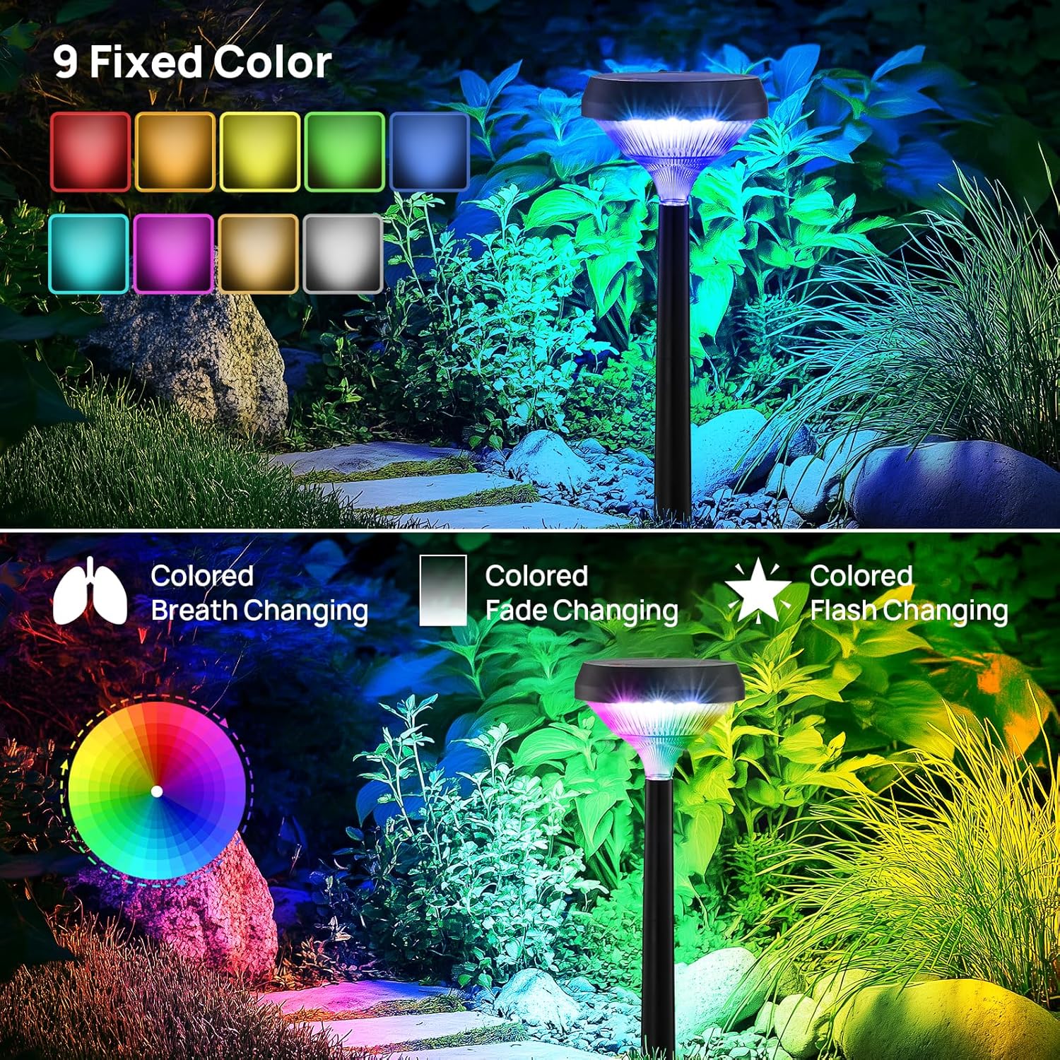 - 【Color Changing+Warm White+Cool White】Color changing solar pathway lights have 9 fixed light modes (Red,Orange,Yellow,Green,Blue,Indigo,Purple,Warm White, Cool White) and 3 color cycling modes (Colored Breath Changing, Colored Fade Changing, Colored Flash Changing). It's a perfect choice for Halloween, Christmas or daily decorations