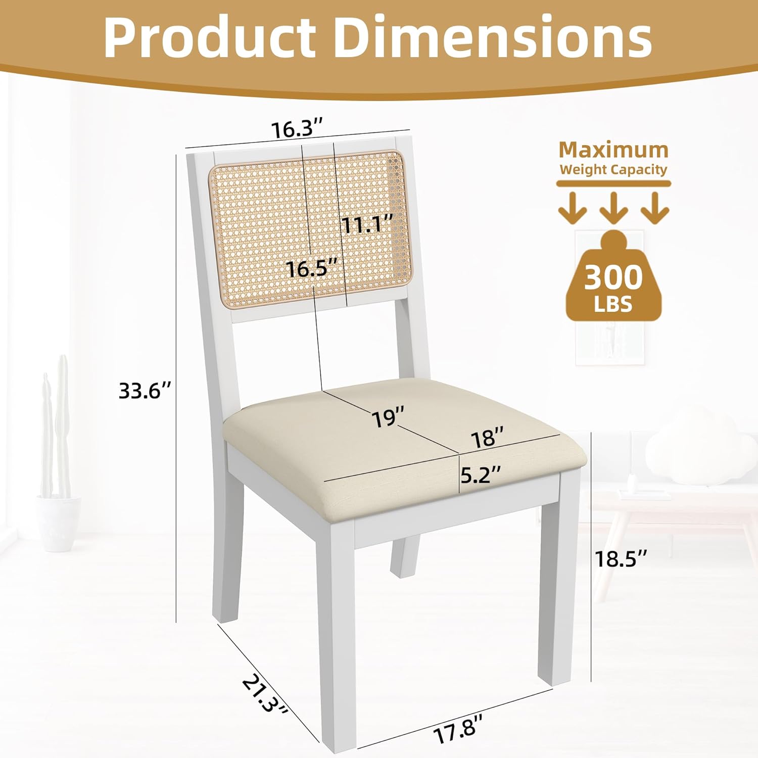 Westice Rattan Dining Chairs Set of 6, Farmhouse Natural Dining Room Chairs with Upholstered Cushion, Wood Armless Chairs for Kitchen/Restaurant, White