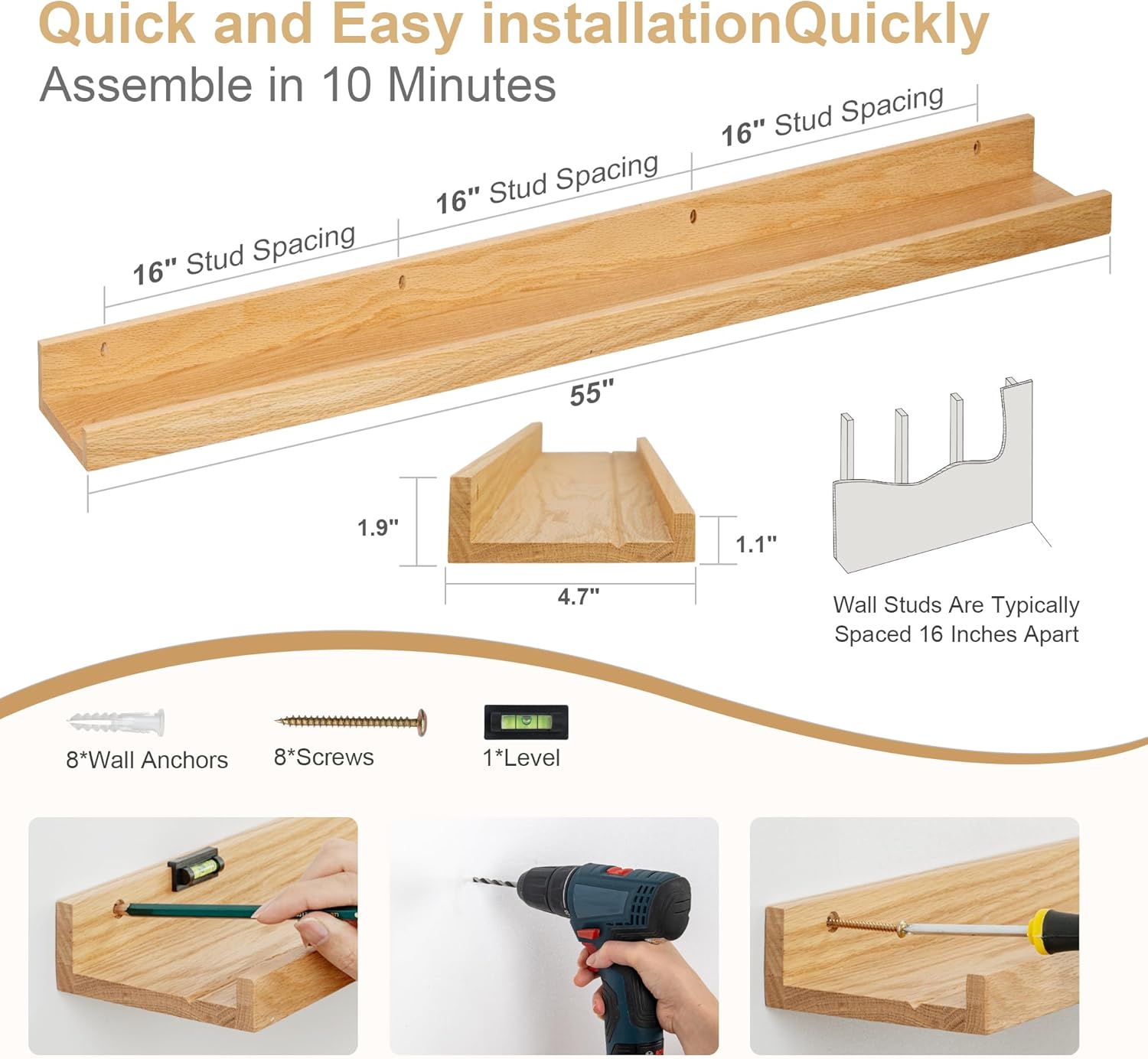 Floating Picture Ledge Shelves 55 Inch Solid Oak Wood Set of 2, Rustic Wall Storage Shelves with Lip, Kids Bookshelf, Photo & Picture Ledge Shelves for Bedroom, Living Room, Kitchen