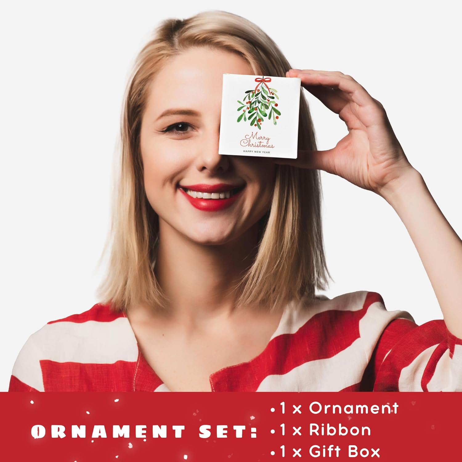 - ORNAMENT SET INCLUDES: You will receive 1x Two-sided Ceramic Ornament, 1x Beige Ribbon and 1x Gift Box. The small hole in the ornament is threaded with our shining beige ribbon for easy hanging, which creates an elegant look for your Christmas tree.
