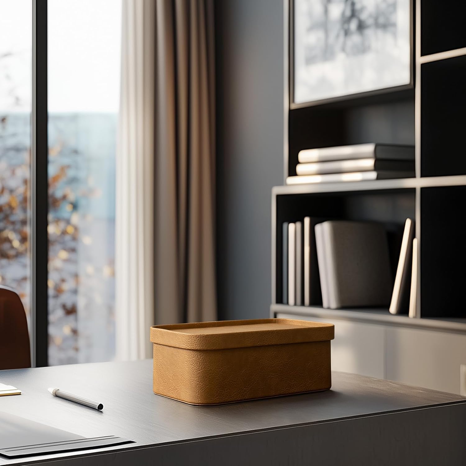 - SUSTAINABLE STYLE MEETS URBAN CHIC: Unleash your inner design maven with our game-changing storage boxes. Dressed in a refined camel vegan leather that screams sophistication, these eco-friendly beauties are more than just storage—they're a lifestyle statement. Crafted from premium MDF and wrapped in buttery-smooth vegan leather, these boxes are your ticket to clutter-free, Instagram-worthy spaces
