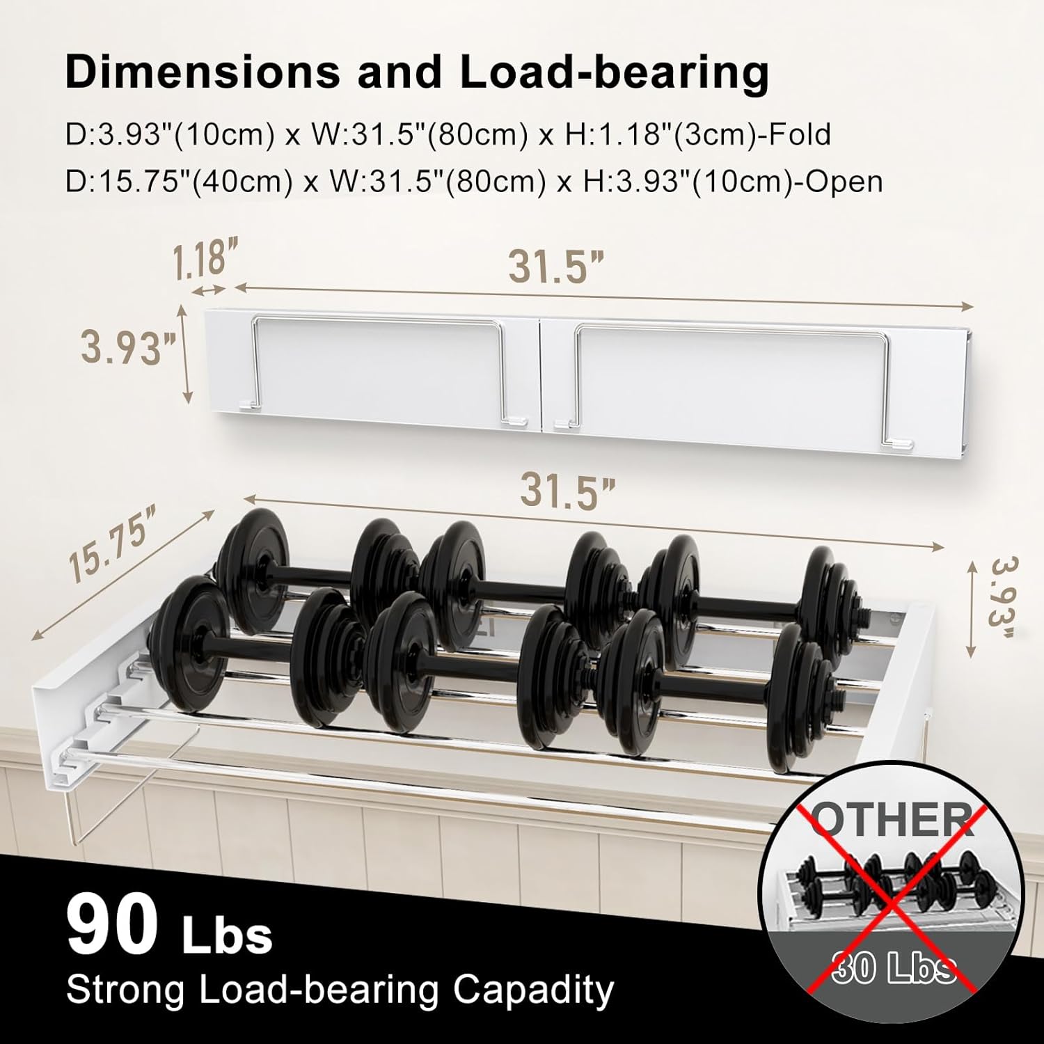 Wall Mounted Drying Rack, Foldable Laundry Rack, Collapsible Drying Rack, 5 Stainless Rods, Wall Mounted Clothing Rod with 2 Towel Bar, 90 lb Capacity, 31.5" White