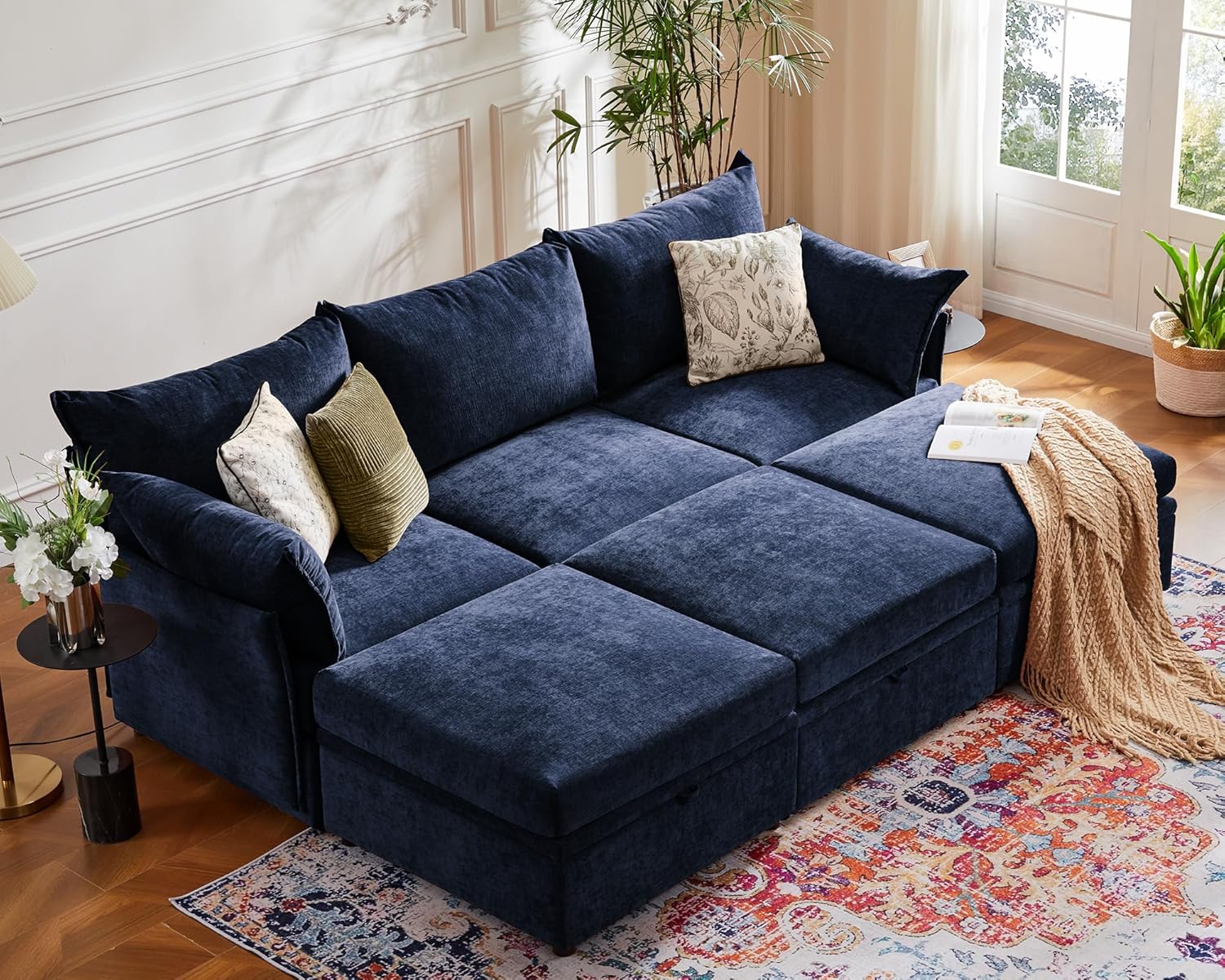 102.6" Luxury Modular Sleeper Sofa Bed 6 Seat Reversible Sectional Couch Deep Seat with Storage Chaises Removable Cover for Living Room, Apartment - Chenille Blue