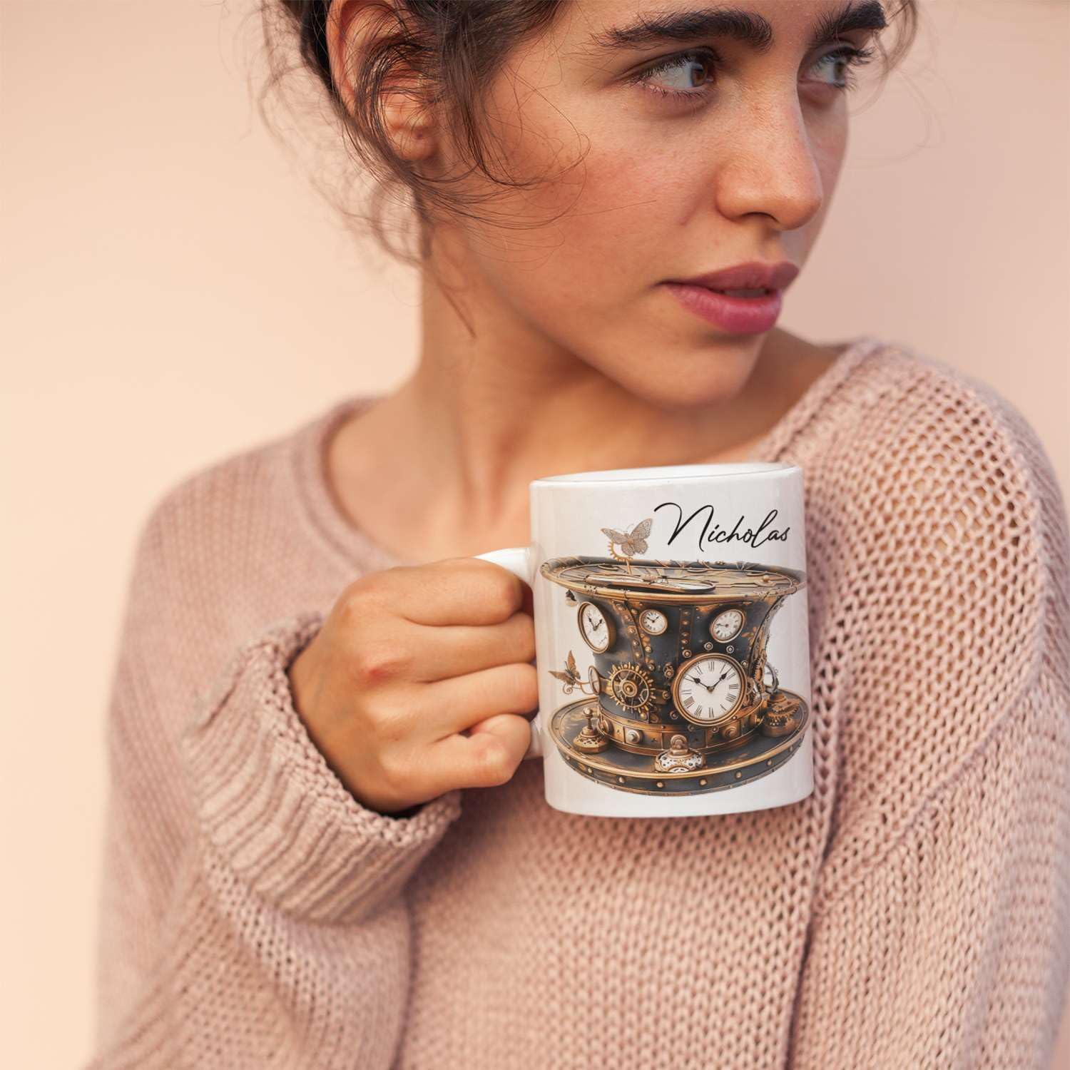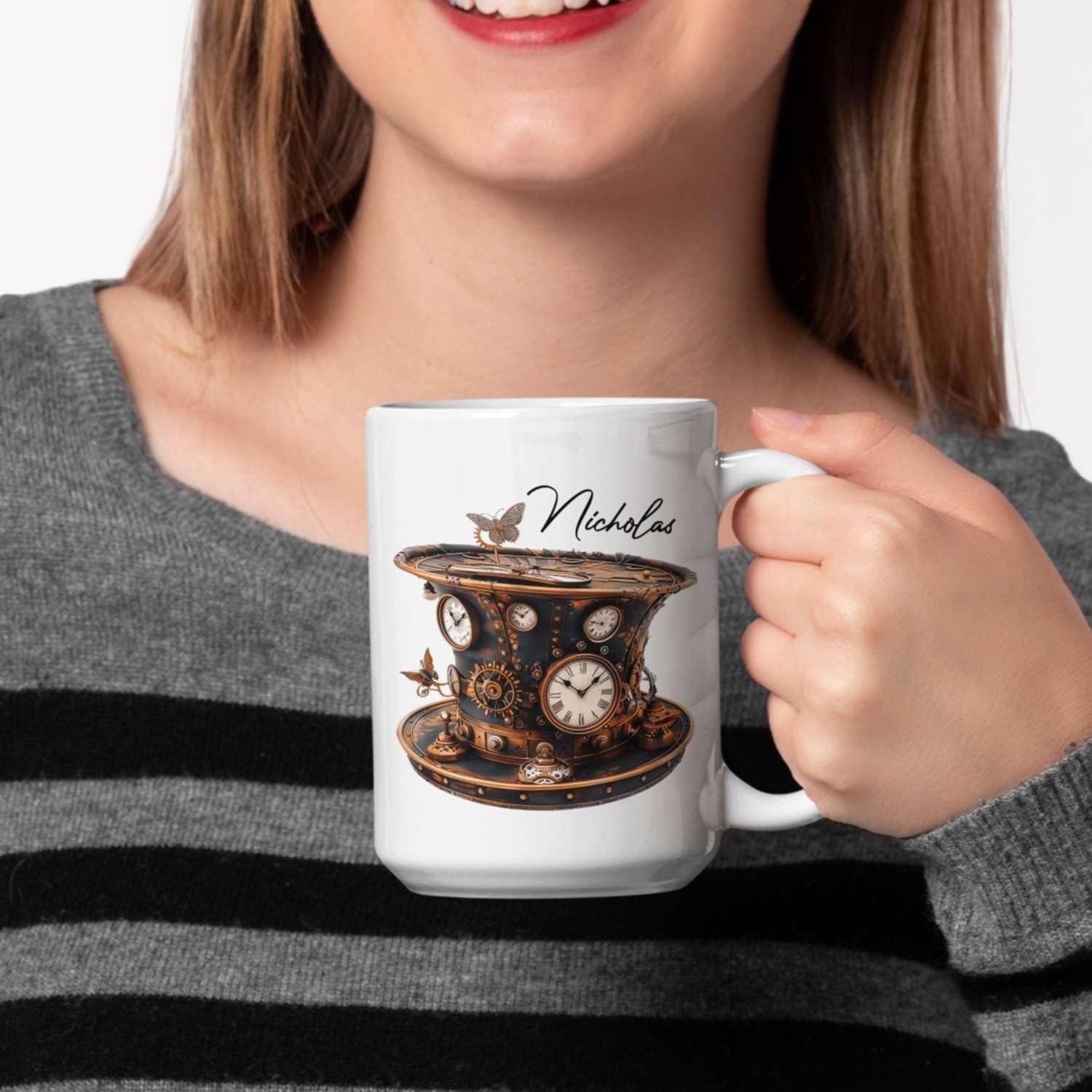 Personalized Coffee Mug Gift For Men, Customized Choose Name White Cup 11oz Or 15oz, Unique Steampunk Design Ceramic Cup, Custom Clock Themed Decorative Cup, Steampunk Decor Mug