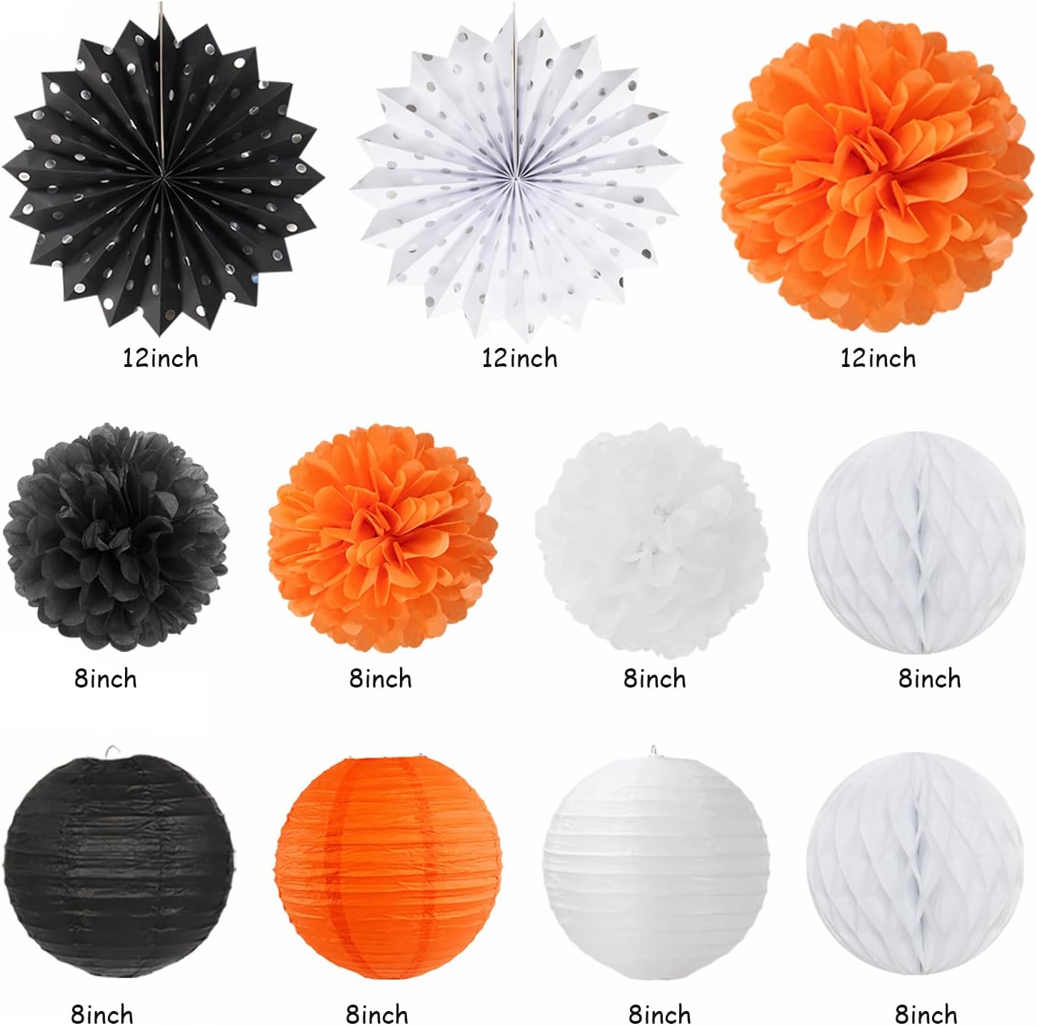 - 【Black White Orange Party Kits】This kits include 1pcs happy birthday banner, 1pcs circle dots paper banner, 4pcs tissue pom poms: 3pcs 10" and 1pcs 12" , 3pcs 8inch paper honeycom ball, 2pcs 8inch paper lantern, 4pcs 12inch paper flower fan, 6pcs Paper swirls hanging streamers.