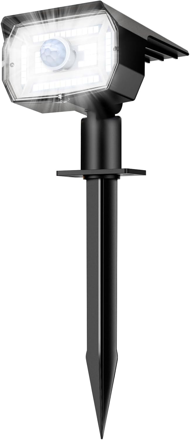- 3 Lighting Modes & Motion Sensor: Solar spotlights have a built-in sensitive PIR motion sensor, which can easily capture motion. There are 3 modes:1.[Sensor light mode]: full brightness when the motion is detected,close when no motion 2.[Dim light sensor mode]:low brightness no motion,full brightness when the motion is detected 3.[ Constant light mode]: auto power on at night, auto power off during the day