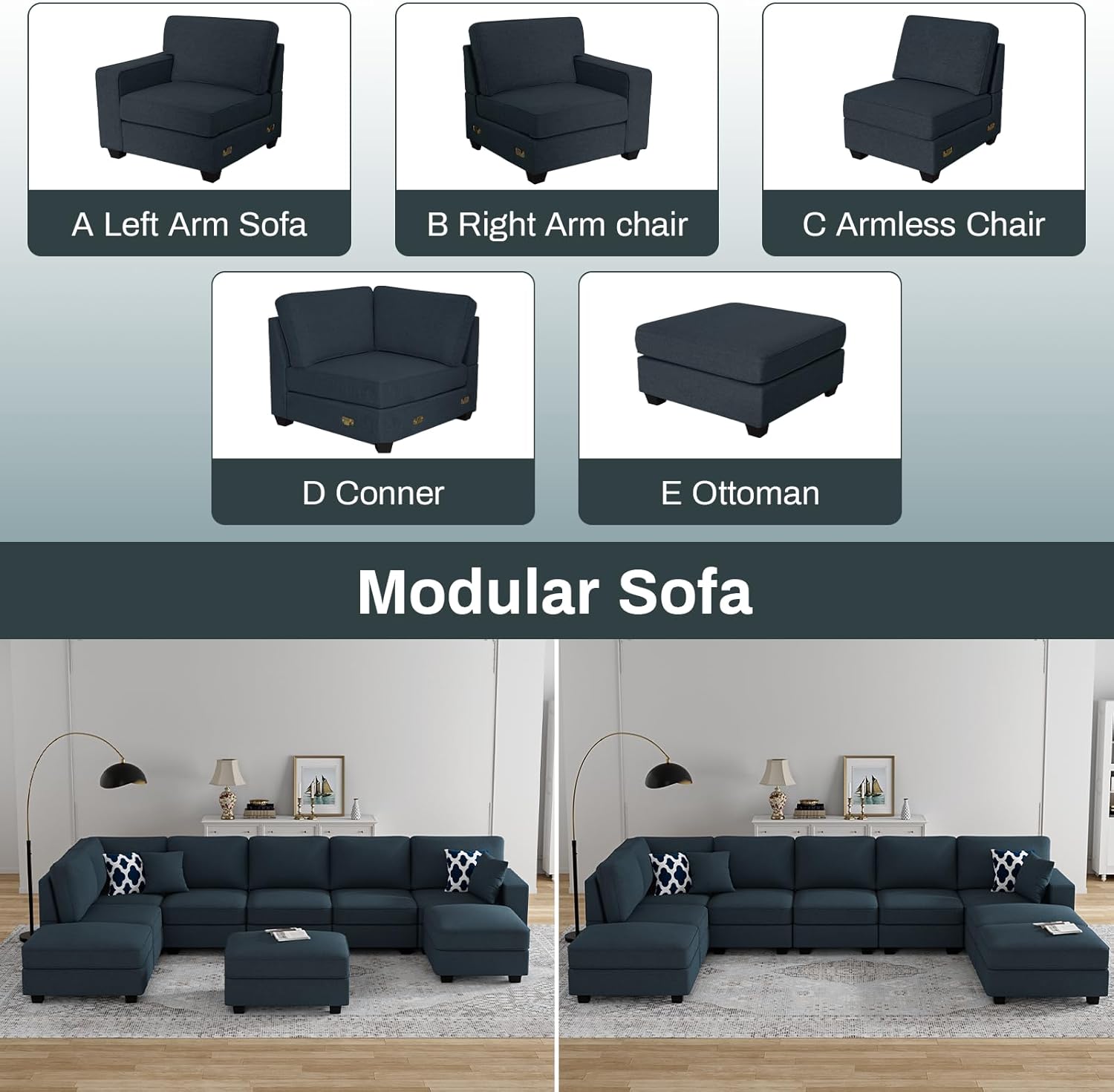 - ăFlexible CombinationăThe u shaped couch can rearrange the seats, you can adjust it as you like to create various shapes and layouts, whether it's combined into an L shaped sofa or a U shaped sofa, this sofa couch can fit your space perfectly. This flexibility not only brings more choices, but also saves your budget, by adding additional modules, you can easily expand the capacity and functionality of the sofa without having to replace the modular sofa completely.