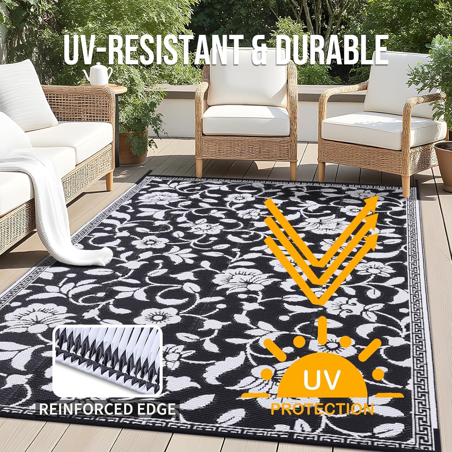OLANLY Waterproof Outdoor Rug 9x12 ft, Outdoor Plastic Straw Rug with Flower Pattern, Reversible RV Mat for Patio, Camping, Balcony, Deck, Backyard, Black & White