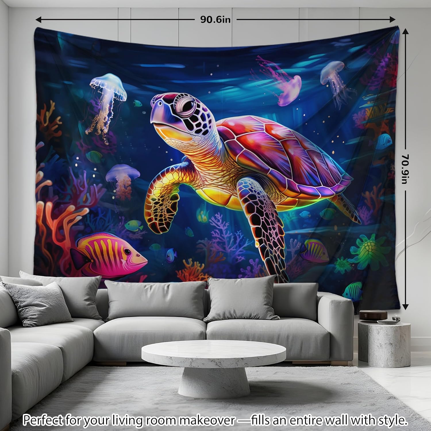 - UV REACTIVE / BLACK LIGHT: Uv sea turtle tapestry is printed with the latest heat transfer technology and UV reactive inks to produce a neon effect under black light. The actual visual effect depends on the power of the light you use, our pictures are taken under 40w 368nm UV light