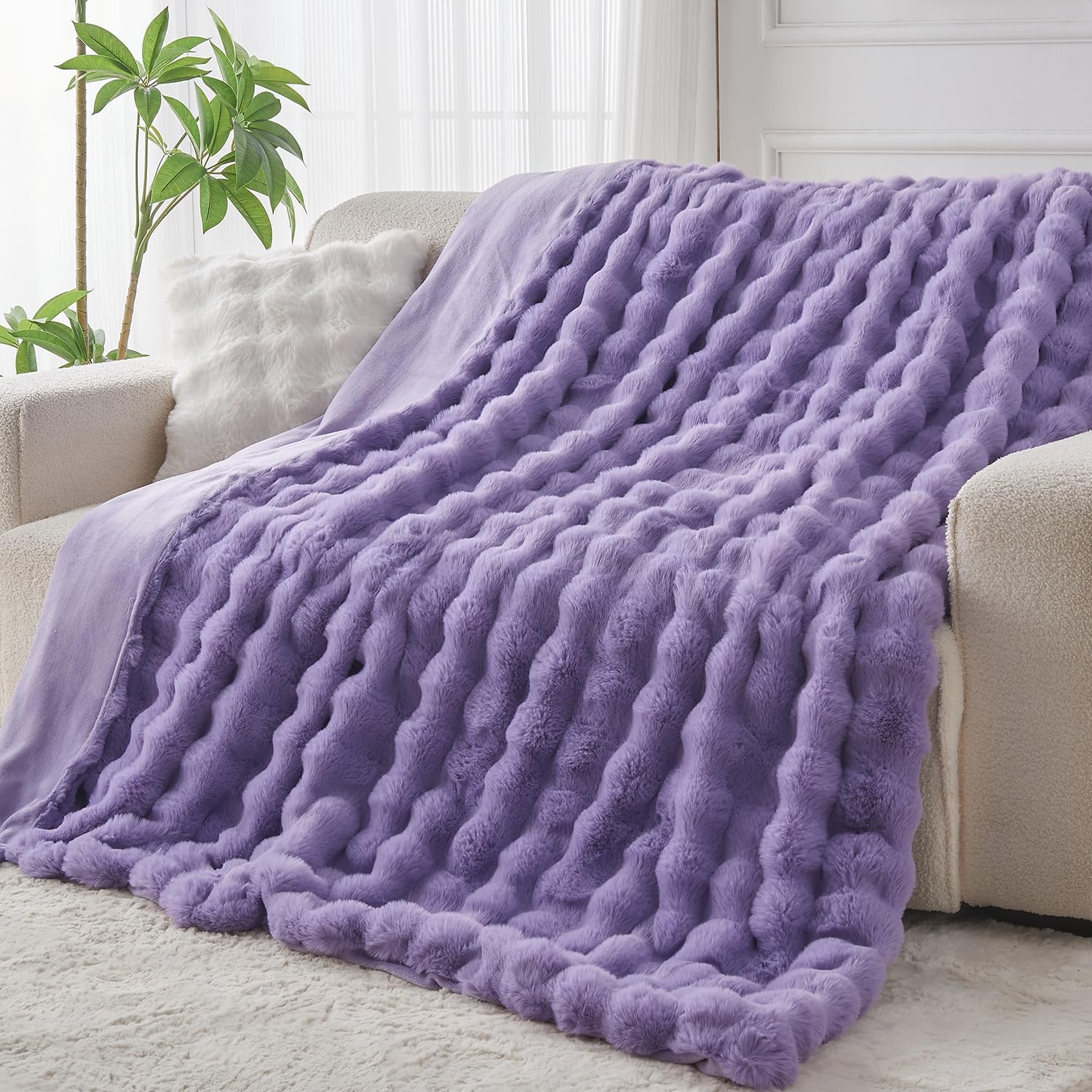 Lotus Karen Faux Fur Throw Blanket Purple - Big Bubble Rabbit Fluff Blanket for Couch Bed Sofa,Softest Fluffy Fuzzy Cozy Blanket,Thick Furry Plush Shaggy Warm Blankets for Women,50x60 Inches