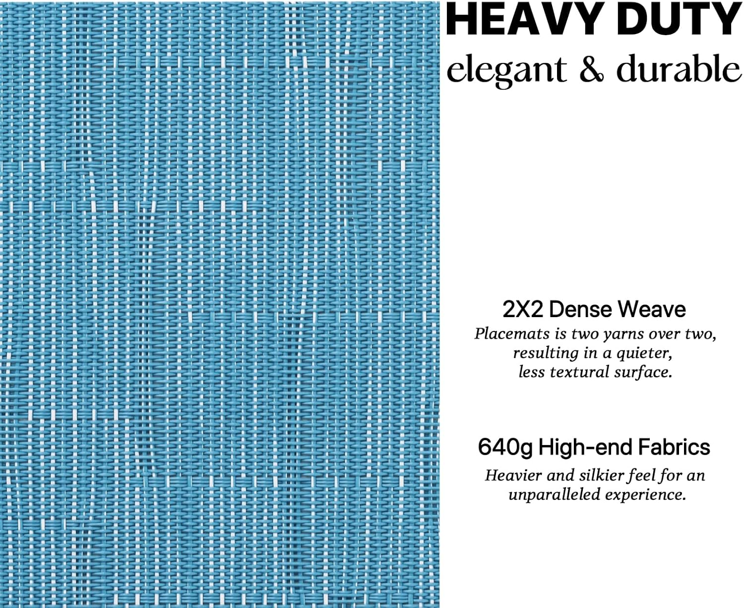 - HEAVY-DUTY:We uses the German-imported higher grammage vinyl material (Specialty PVC)than other placemats on the market,plus the precise,dense weave craftsmanship to give the woven placemats a thicker feel and make the place mats long-lasting.