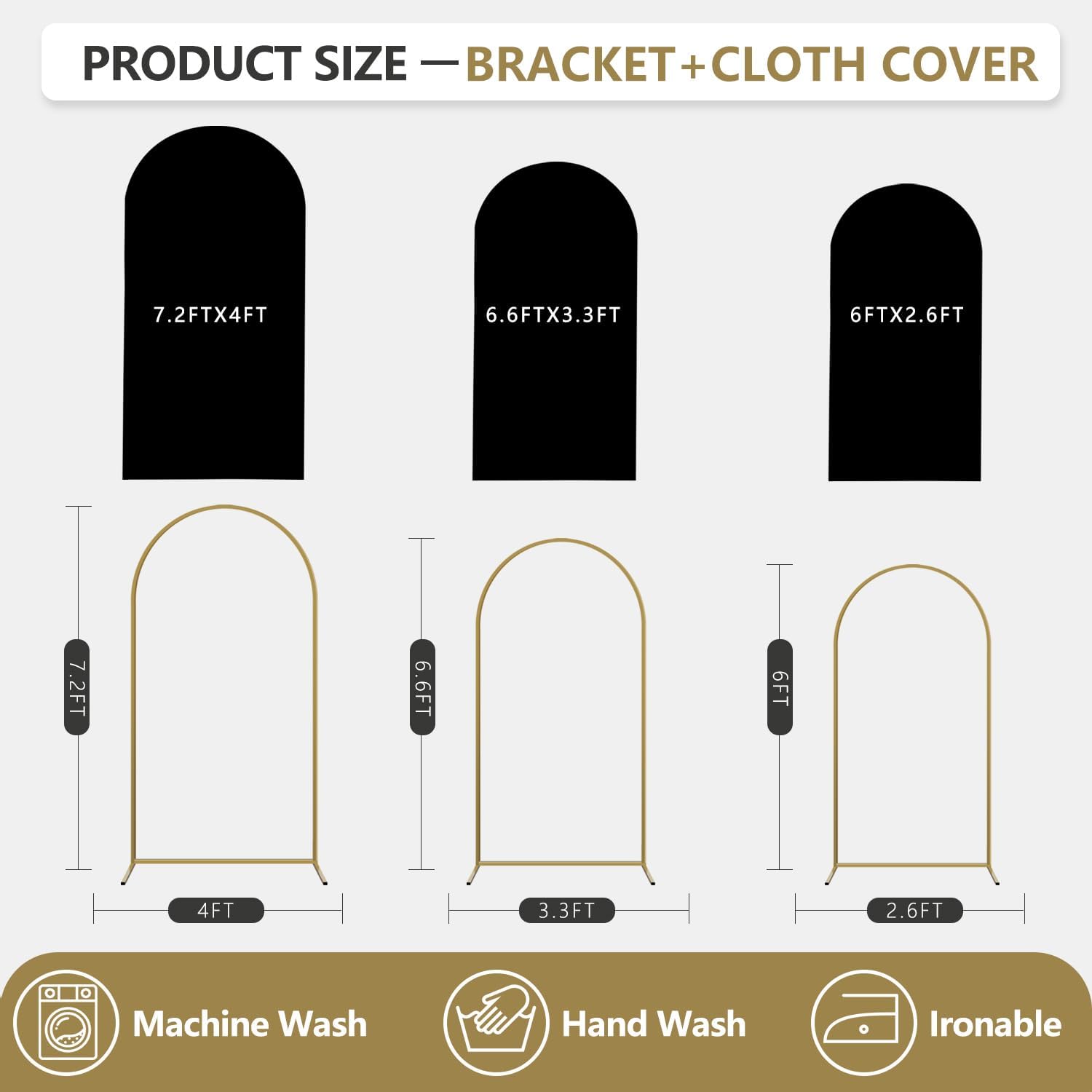 - Arch Backdrop Stand Sizes: We offer a range of gold arch stand sizes to suit your needs, height of 4ft, 5ft, 6ft, 6.6ft, and 7ft. This versatile arch stand is perfect for creating stunning backdrops for any party, wedding, or event decoration, ensuring a memorable setup every time.