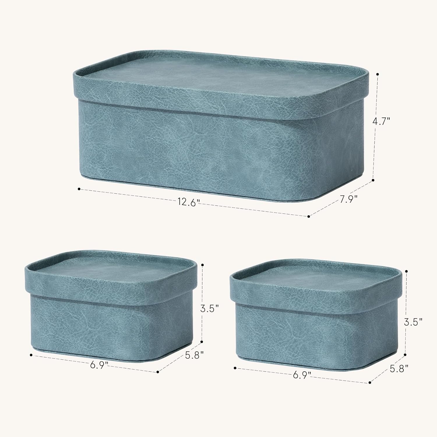 - SUSTAINABLE STYLE MEETS URBAN CHIC: Elevate your living space with our sophisticated storage box set, where timeless style meets practical elegance. Wrapped in a textured dusty blue vegan leather and crafted from sturdy MDF, these eco-friendly organizers effortlessly combine form and function. Designed to blend seamlessly into modern decor, these storage boxes keep your home polished, clutter-free, and effortlessly chic. The rich color and premium materials lend a refined, upscale aesthetic that elevates any room