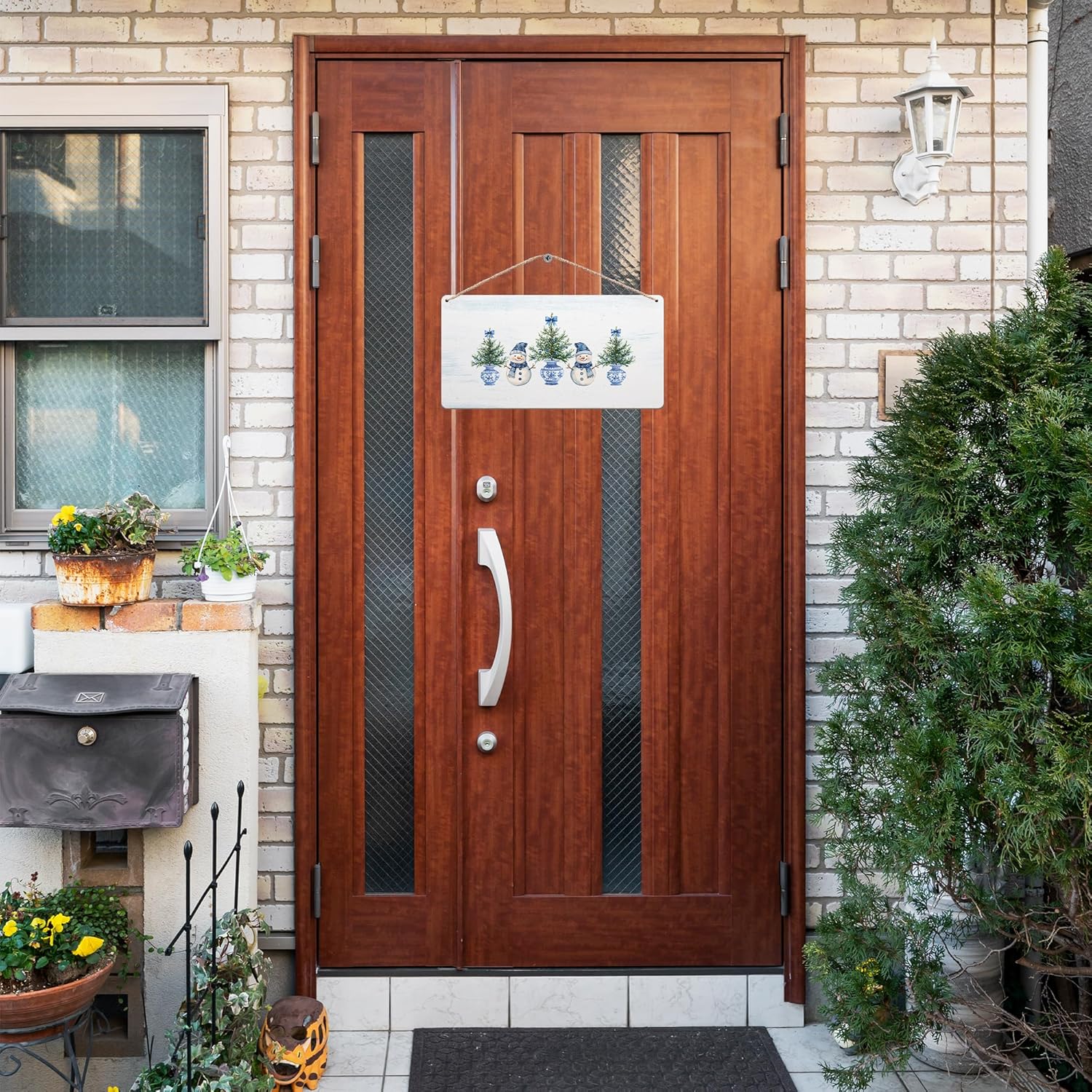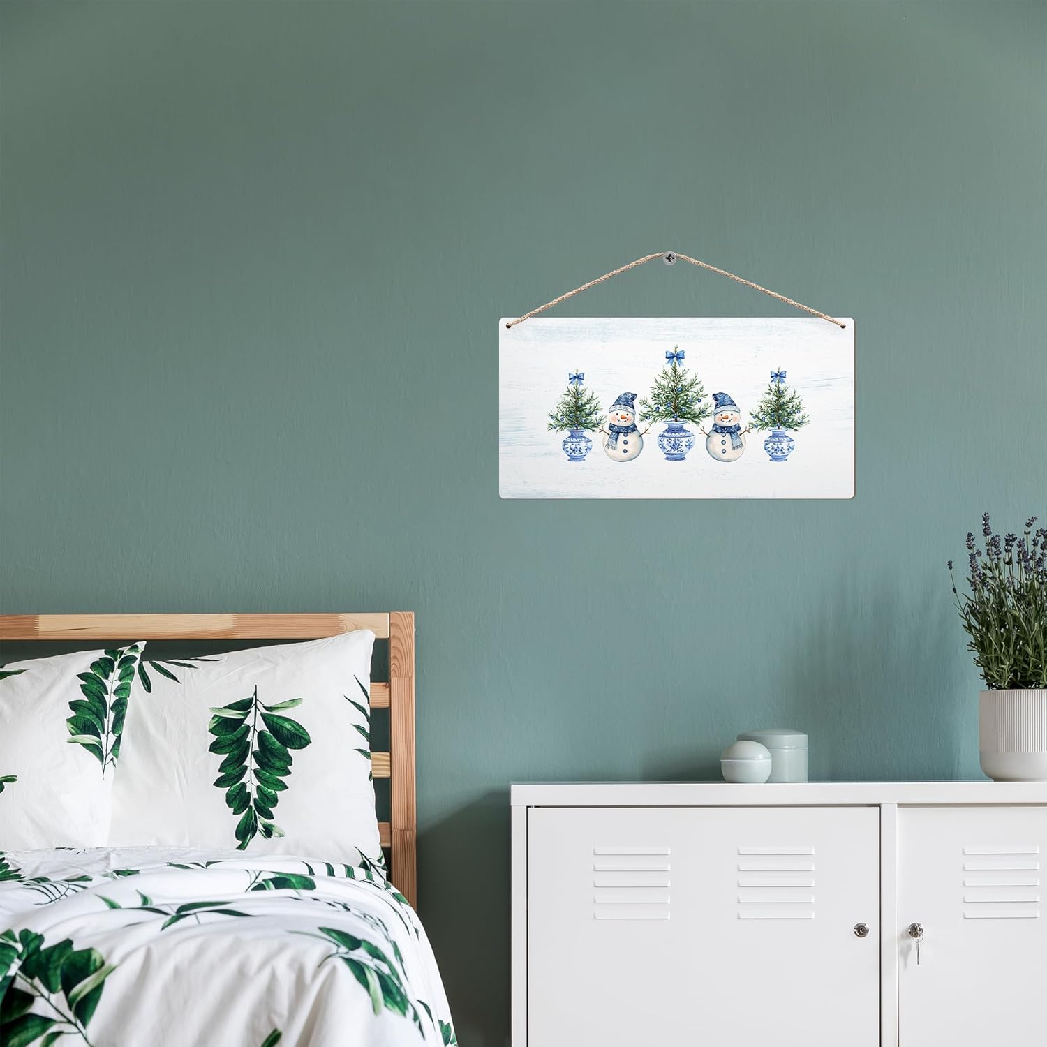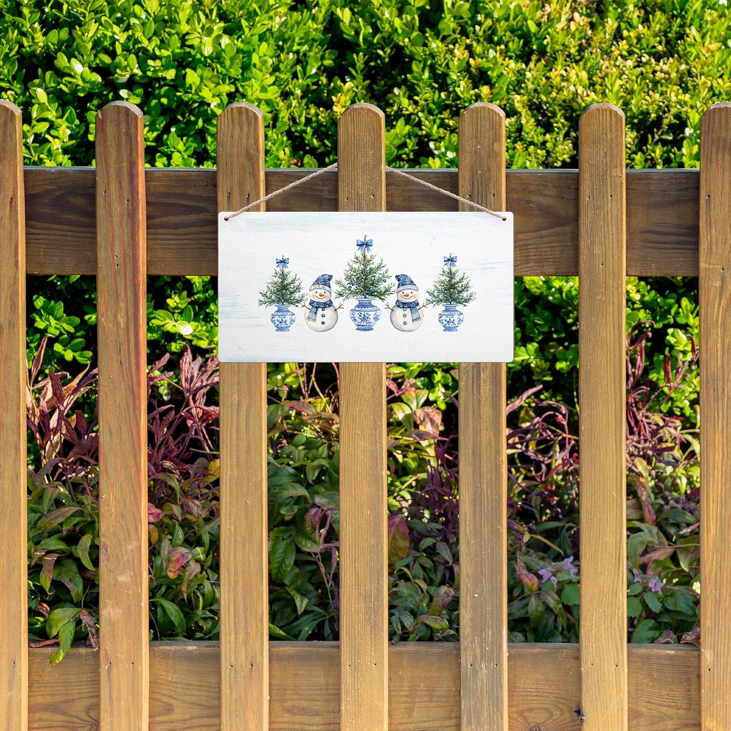 DUXMNAMG Chinoiserie Snowman Winter Hanging Wooden Signs 12x6, Blue and White Porcelain Snowman Sign, Winter ChristmasTree Blue Bow Snowman Chinoiserie Signs for Home Room Office Hanging Wall Decor