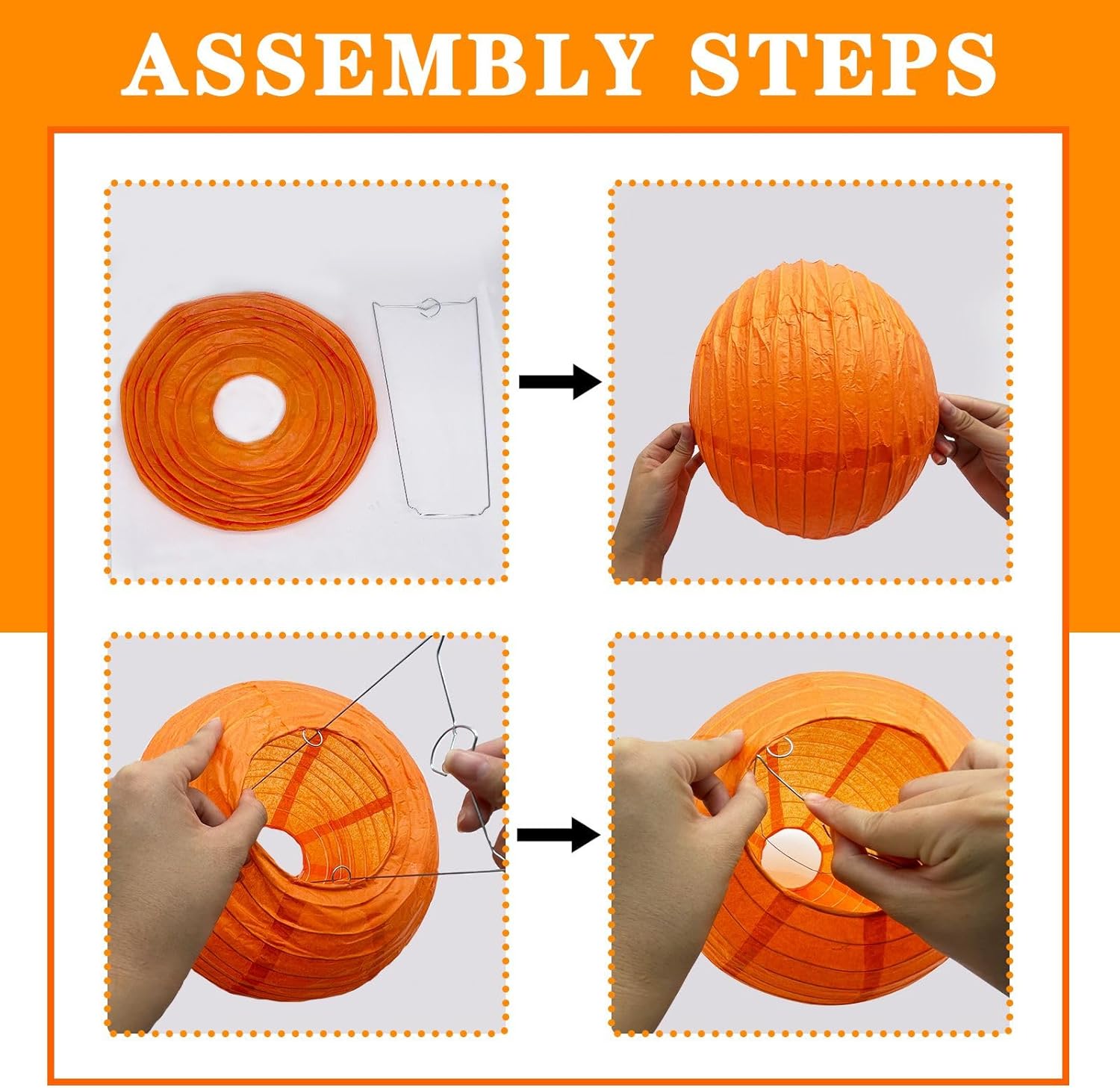 - 【Easy to assemble】: Our lanterns are easy to unfold, assemble and hang up, and they can be folded flat for storage. All you need to do is to pull the two ends gently to open the lantern and insert the metal frame (included in the pack) into the lantern to keep its shape.