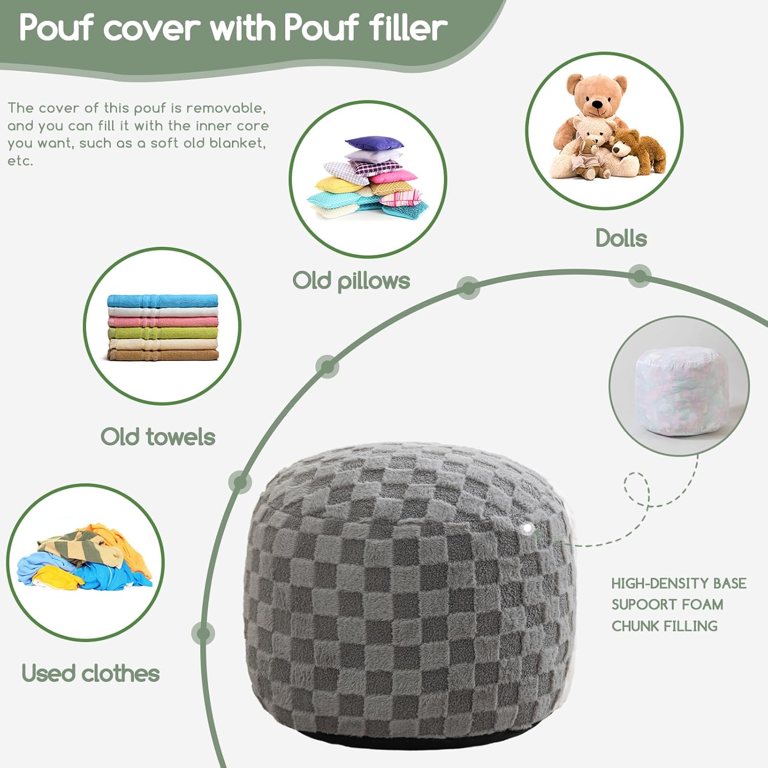 HIGOGOGO Round Stuffed Pouf Ottoman, Plaid Poufs with Foam Chunk Filling, Fluffy and Furry Pouf Foot Stool Storage Ottoman, 26 X 18 Floor Poufs Foot Rest for Living Room, Grey
