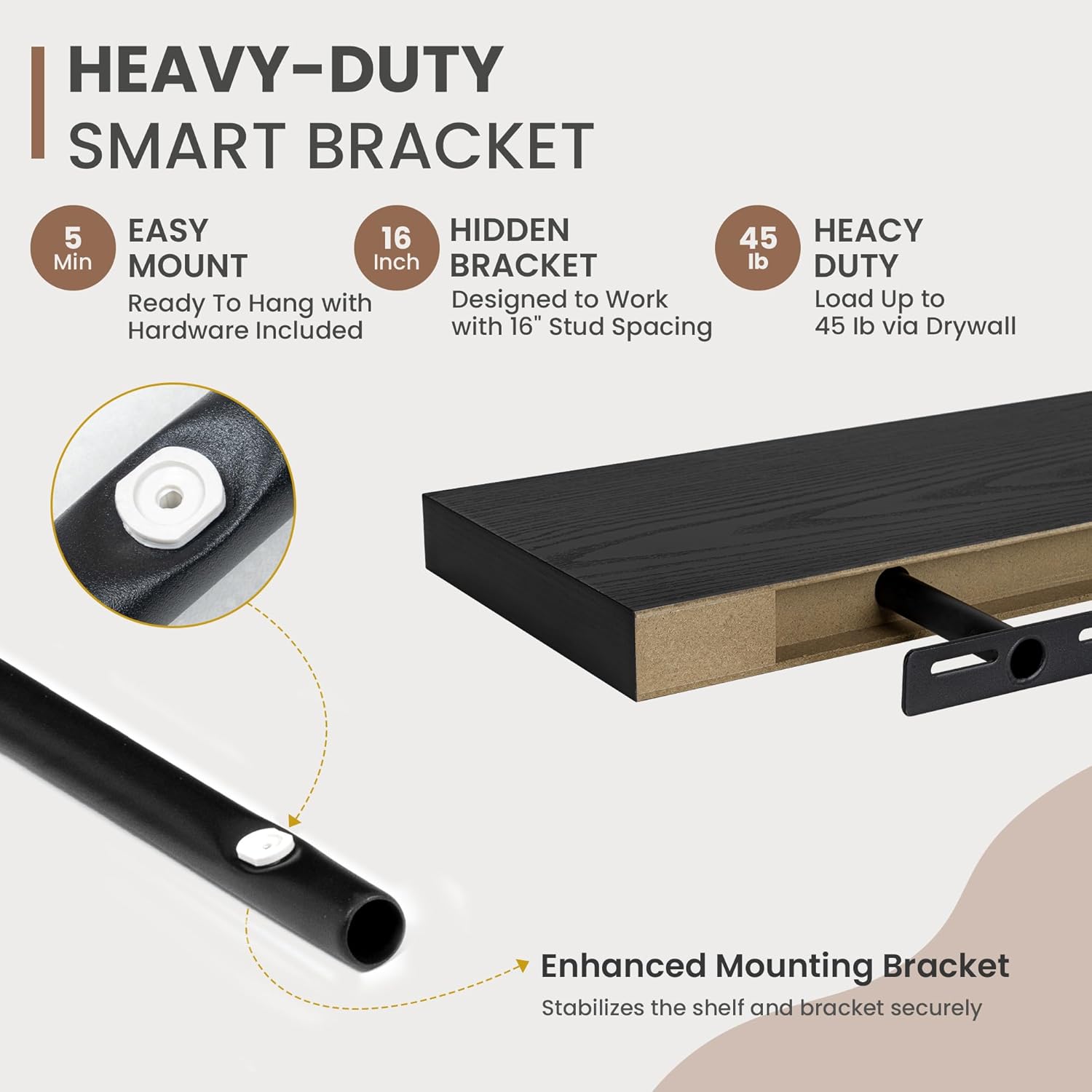 - [STABLE & SECURE INSTALLATION]: Equipped with a robust, hidden mounting bracket, these 48 inche floating shelves provide solid support for your items. Designed for easy, secure installation, they include all necessary hardware for a firm, wobble-free setup, so you can confidently display decor, photos, or functional items with style.