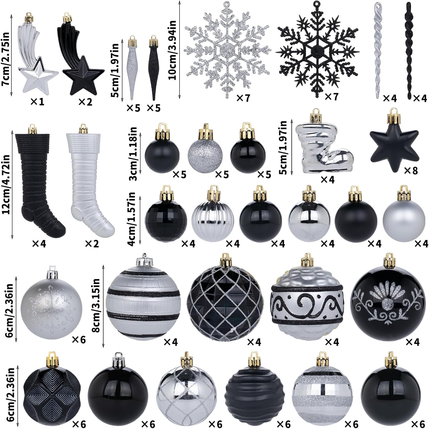- 【SUFFICIENT QUANTITY】 This christmas ball ornaments set has 97 christmas balls, 14 snowflakes, 6 christmas stockings, 3 meteors, 8 stars, 18 icicle and 4 shoes, suitable for use in decorating 6 feet or 9 feet christmas tree, table decoration and DIY of garland or wreath, also a great christmas gift