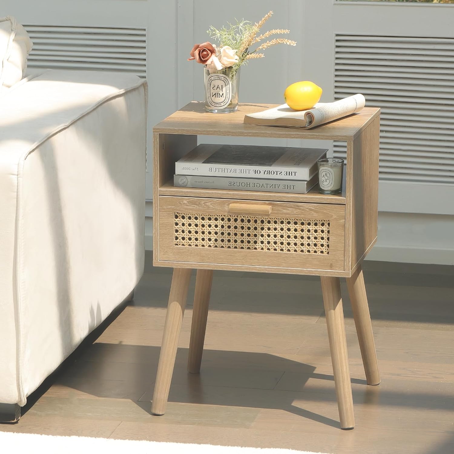 MaxSmeo Rattan Nightstand with Drawer, Mid Century Modern Wood Bedside Table for Living Room, Bedroom and Small Spaces (Rustic Walnut)