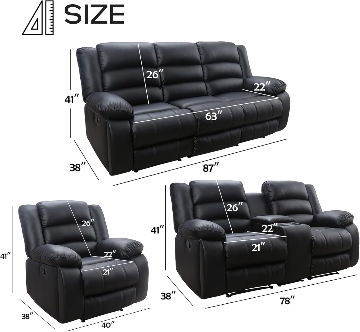EBELLO Manual Faux Leather Recliner Sofa Set, Recliner Chair, Loveseat Reclining Sofa and 3 Seat Sofa, Couch Set for Living Room, Bedroom, Meeting Room, Black