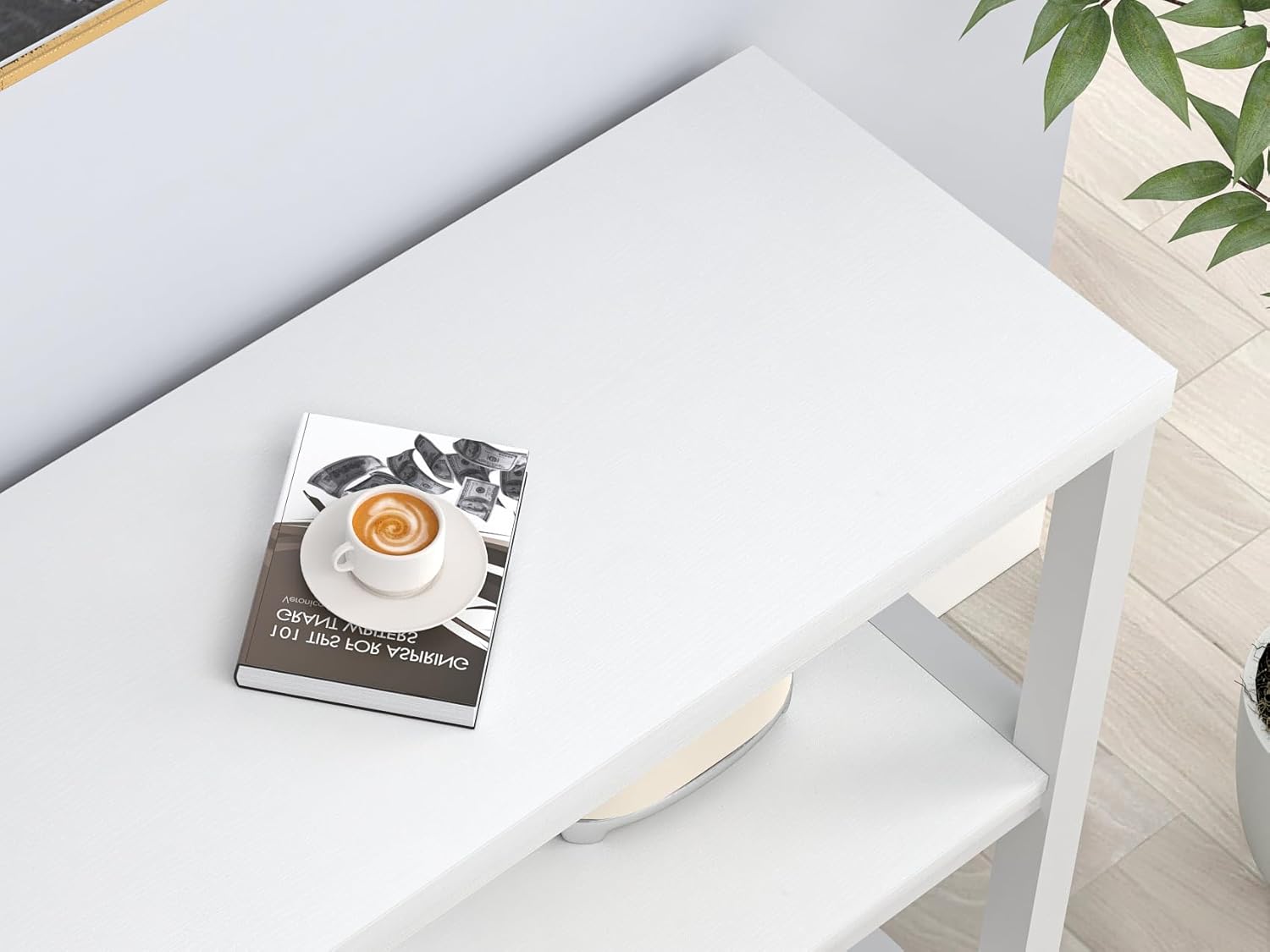 - Modern Console Table: Blending white wood grain finish with a white metal frame, this entry way table combines rustic charm with industrial aesthetics. Sleek vertical lines exude minimalist styles, making the modern sofa table a stylish furniture
