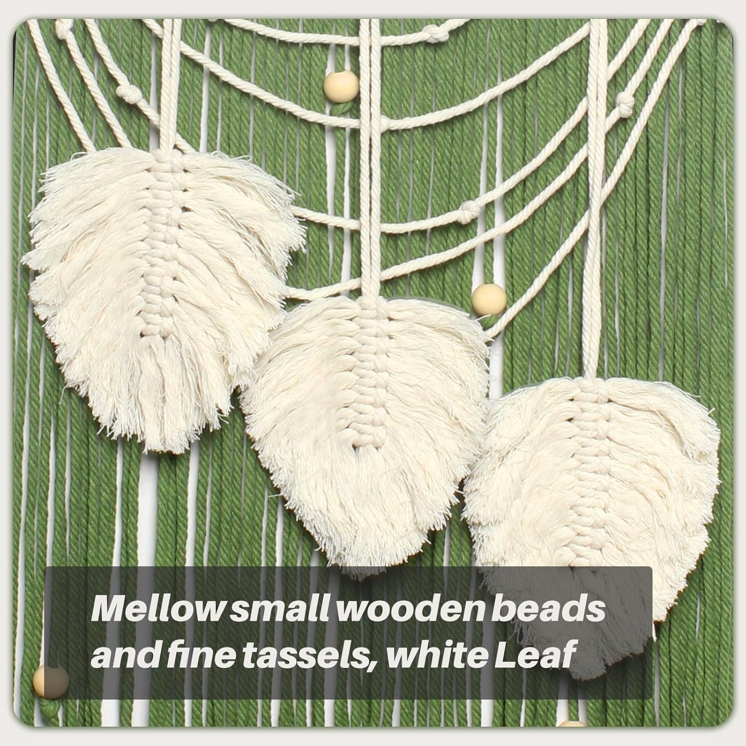 - Premium Quality Macrame: Unique boho room excellent decoration , this meticulously knitted wall hanging macrame with beautiful weaving pattern is made of natural rope, which knotted on the wooden dowel,and features fringe accents, mellow small wooden beads and white leaves.