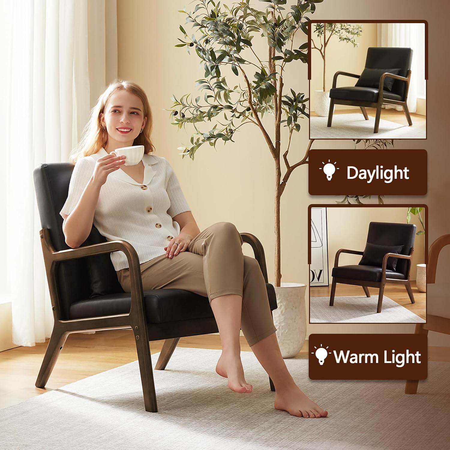 Accent Chair Mid Century Modern Armchair with Lumbar Support Pillow Wood Legs PU Leather Upholstered Lounge Chairs Comfy High Back Cushion for Living Room Bedroom