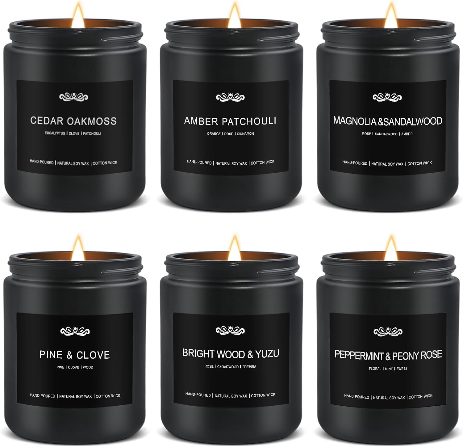 - Men Candles Set: We have carefully blended 6 different fragrance types, Cedar Oakmoss, Amber Patchouli, Magnoli&Sandal Wood, Pine&Clove, Bright Wood &Yuzu,Peppermint&Peonyrose.Each scent is carefully blended by professional perfumers, with rich layers and long-lasting charm, which can bring you a unique olfactory experience.