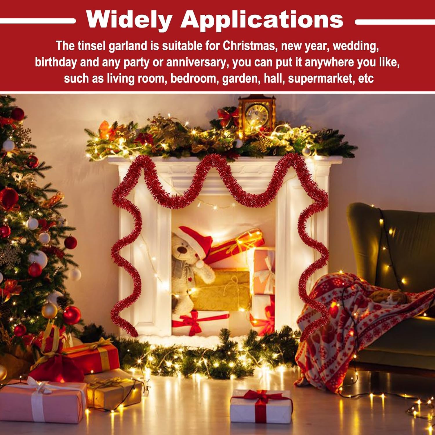 - Easy to Hang: Christmas tinsel garland include a soft, bendable wire inside, and easy to shape as different looks. You can also trim it into different sizes, twist them into various shapes as you like, or with the tape stick it on the wall, window, table, door, rail or any place you like, show the christmas glamour to make your party decoration for the home fun