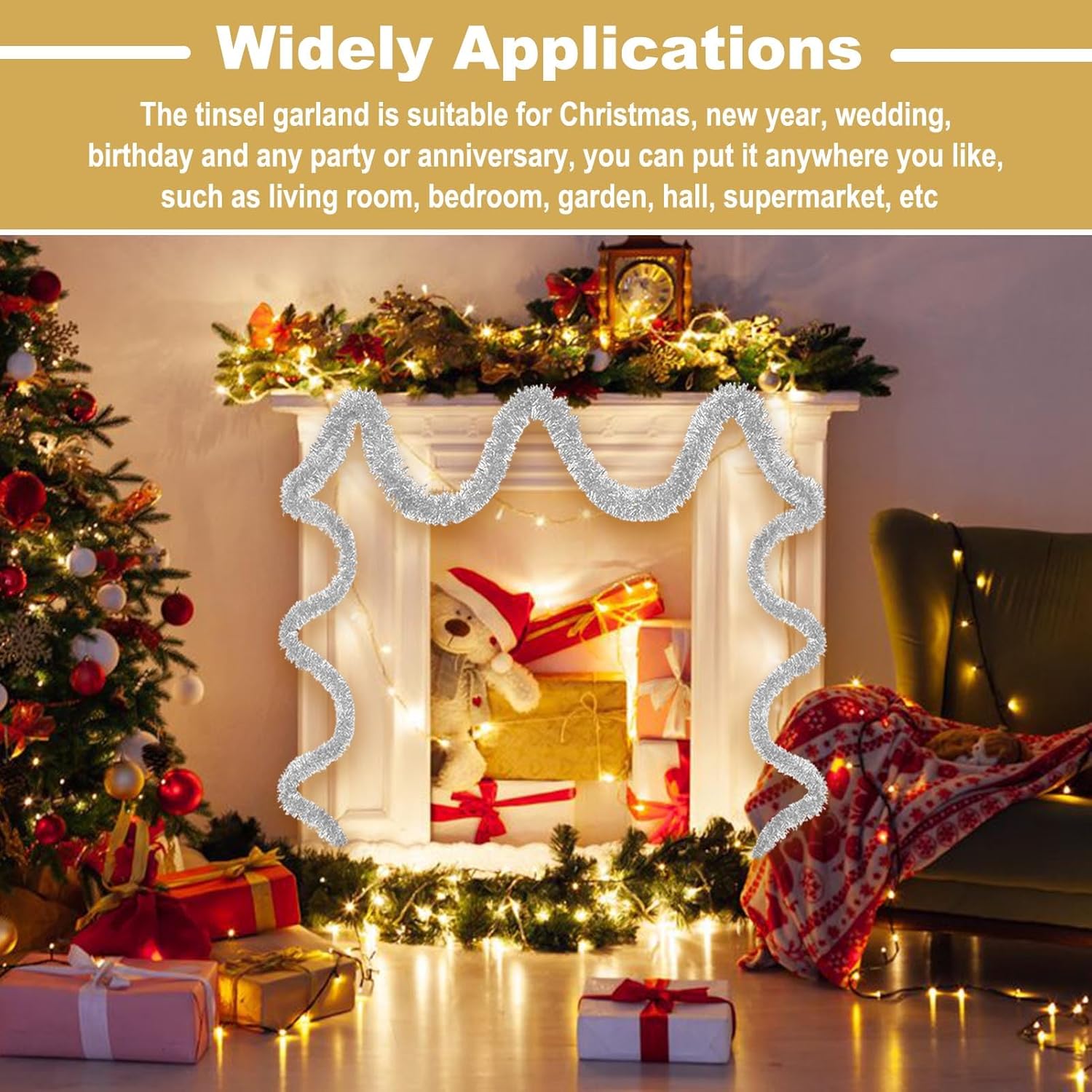 - Wide Application: Suitable for all kinds of special days, such as christmas, new year, valentine's day, halloween, festivals, wedding, engagement, bridal baby shower, graduation celebrations. The tinsel garland are perfect decorations for party, home decorations, parade float, garden, christmas tree, christmas wreath, wall, ceiling, door, hedge, stair rail, doorway, window, pole, table and so on