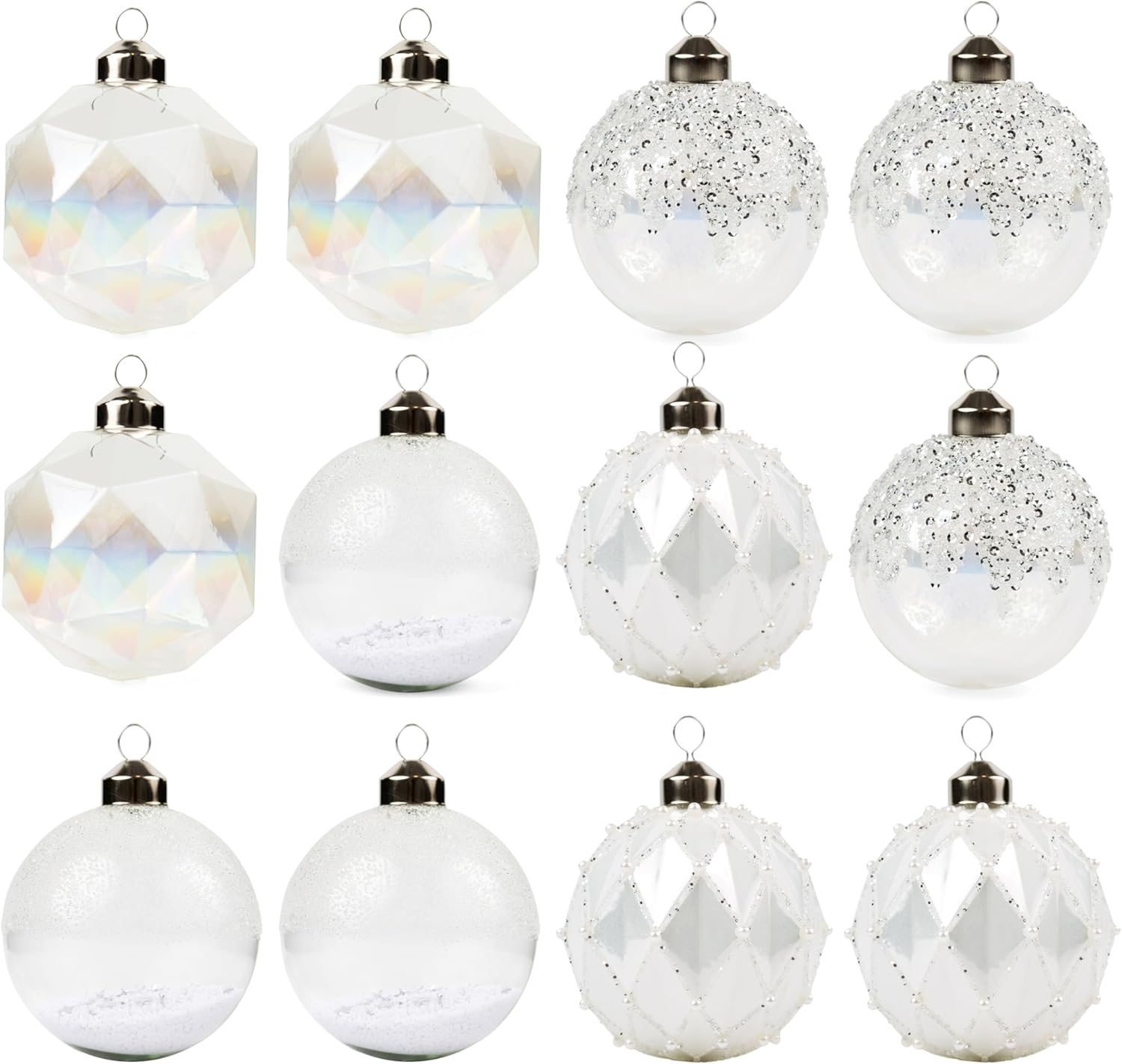 - A beautiful assortment of iridescent and crystal-shaped glass ornaments with matching silver hardware and ribbon hangers