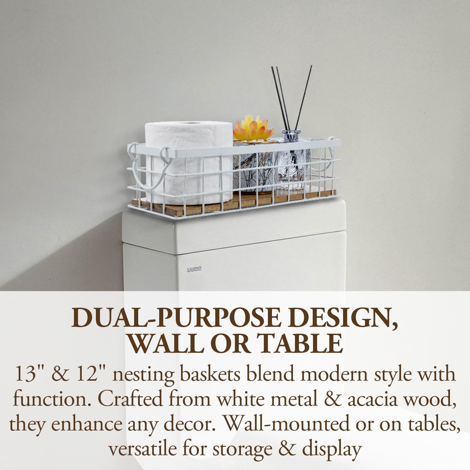 MyGift 13 and 12 Inch Nesting Storage Baskets with Handles, Wall Mounted or Tabletop White Metal Wire and Premium Acacia Wood Decorative Shelf Organizer Bins, 2 Piece Set