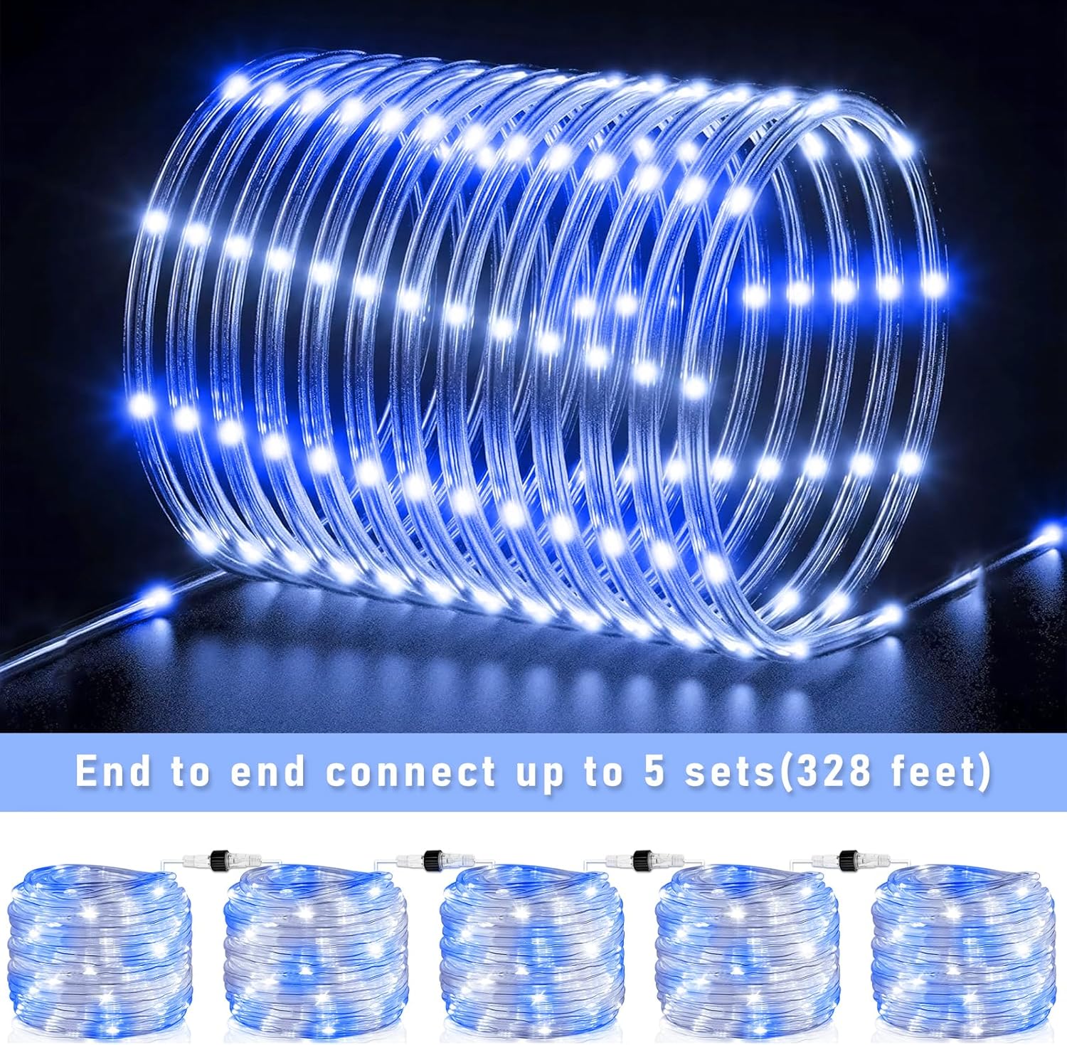 - ăUpgraded Connectable Rope Lightsă- Our rope lights for outside feature a 66ft lighting length with a 6.6ft lead wire, total 72.6ft length. LED bulbs are spaced 4 inches apart to provide bright and soft lighting. The led rope lights can be connected end to end up to 5 sets, long enough to meet your creative lighting decor needs.