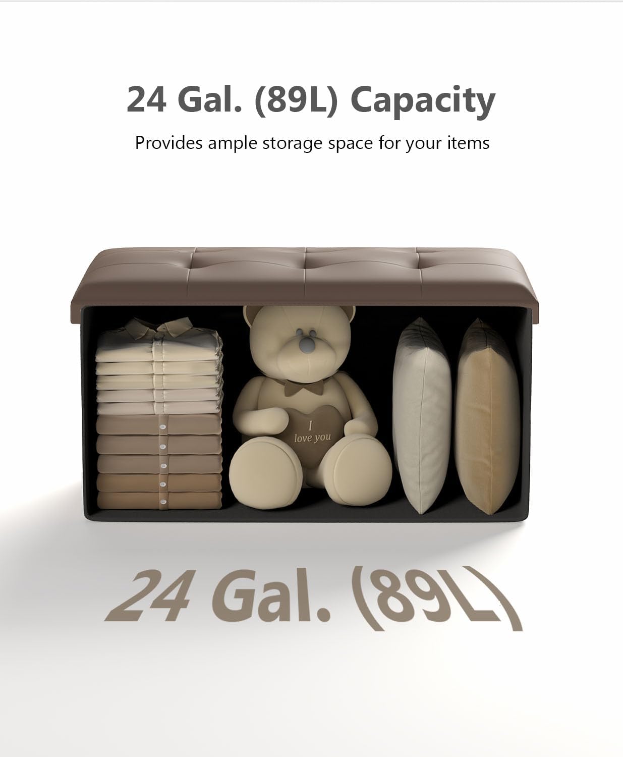 - [Plenty of Storage Space] This folding ottoman, sized 15”D x 30"W x 15”H (38 x 76 x 38 cm) with a total capacity of 24 gallons, can be used to neatly organize your bed sheets, pillows, blankets, magazines, and more
