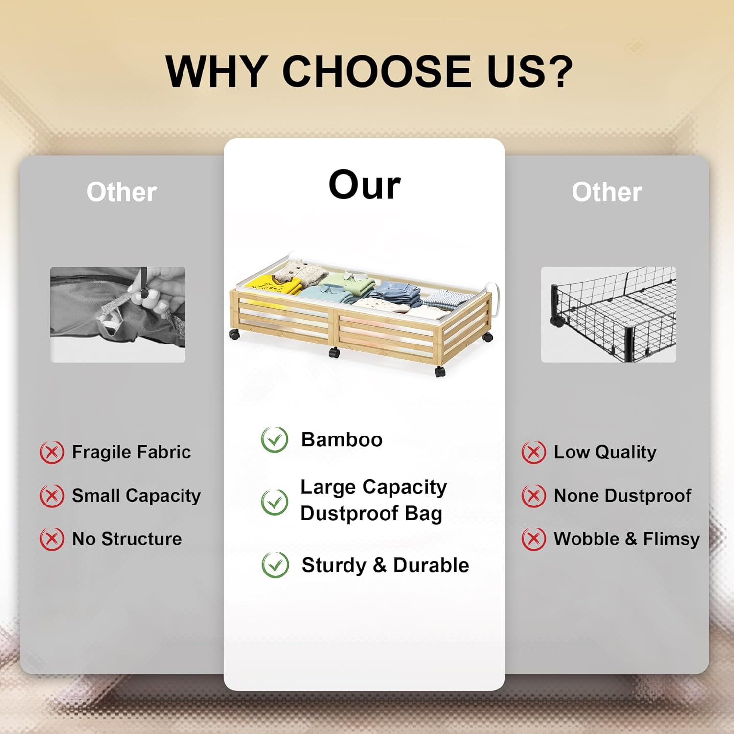 Under Bed Storage Containers With Wheels - 2 Pcs Large Bamboo Wood Rolling Underbed Shoe Storage Bins With Dust Bags for Clothes Blankets, Duvet Covers Snacks Toys (Natural)