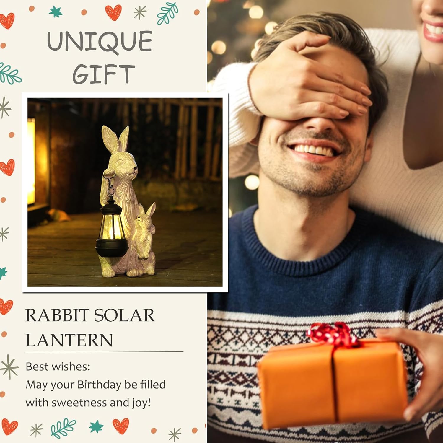 - Rabbit with Solar Lantern Outdoor Statues : The cute handmade rabbit decor symbolizes good luck, joy, and prosperity, adding warmth and elegance to any space. Enjoy beautifully illuminated solar garden decorations outdoor lights with no need for cords or frequent maintenanceāit's good for the environment and your wallet.
