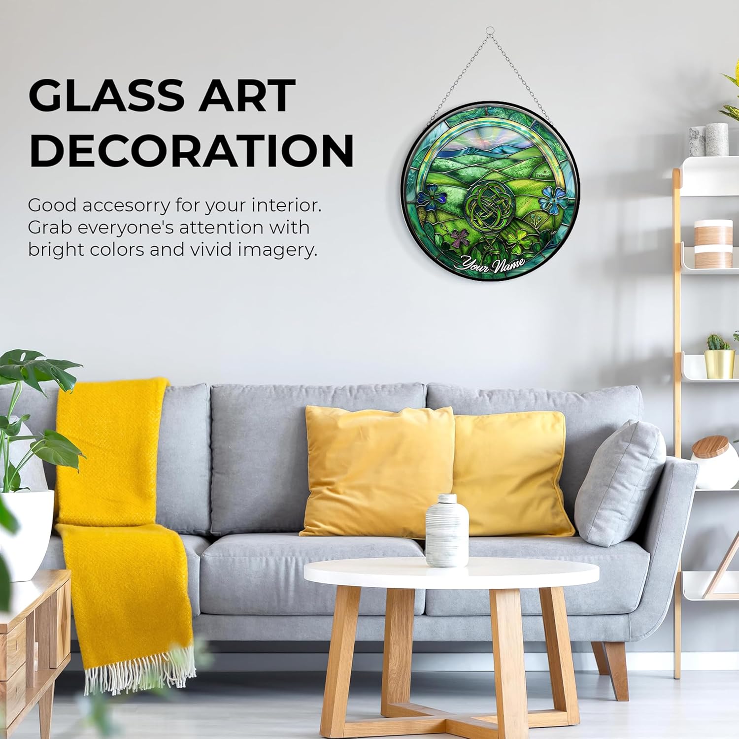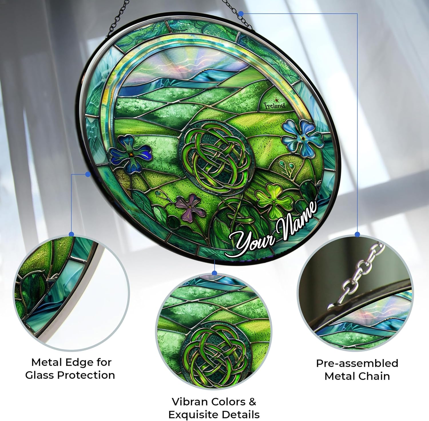 Ireland Stained Glass Sun Catcher, Custom Name Wall Hanging Colored Decor Room Indoor Window Decor, Halloween, Christmas Hanging Ornament Mother Day