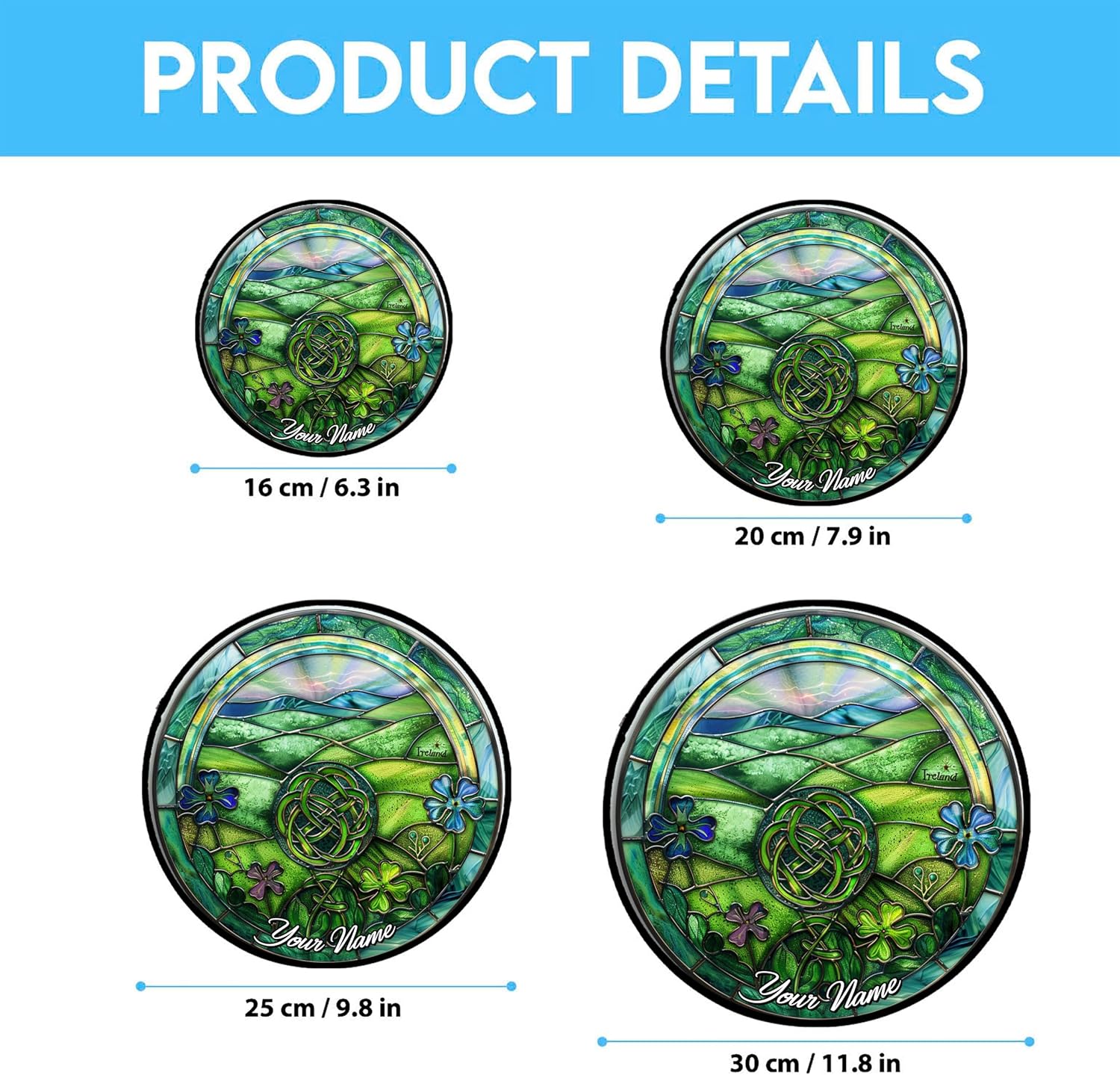 - [EASY TO HANG] ireland stained glass panels have 4 different size and you can custom: 6.3", 7.9", 9.8", 11.8" ,equipped metal chain, metal edge for glass protectionthe size is 34cm/13.4inch. You can hang it anywhere you want, window or courtyard. It's an excellent decoration for homes, offices, shops, restaurants, cafes, or wedding parties