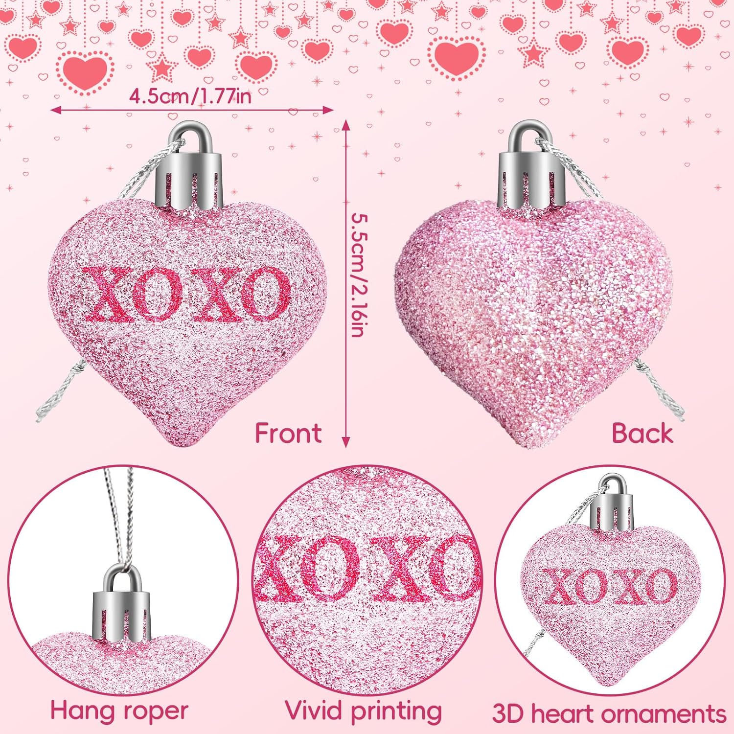 - Valentine's Day Heart-Shaped Ornaments: Package includes 24 pieces 3D Valentine's Day heart shaped ornaments in red, pink, rose gold and silver. The size of each Valentine's Day ornaments is 1.77x1.77 inches. As an ideal decoration for outdoor and indoor parties, Valentines heart decorations add sweet and romantic color to your life