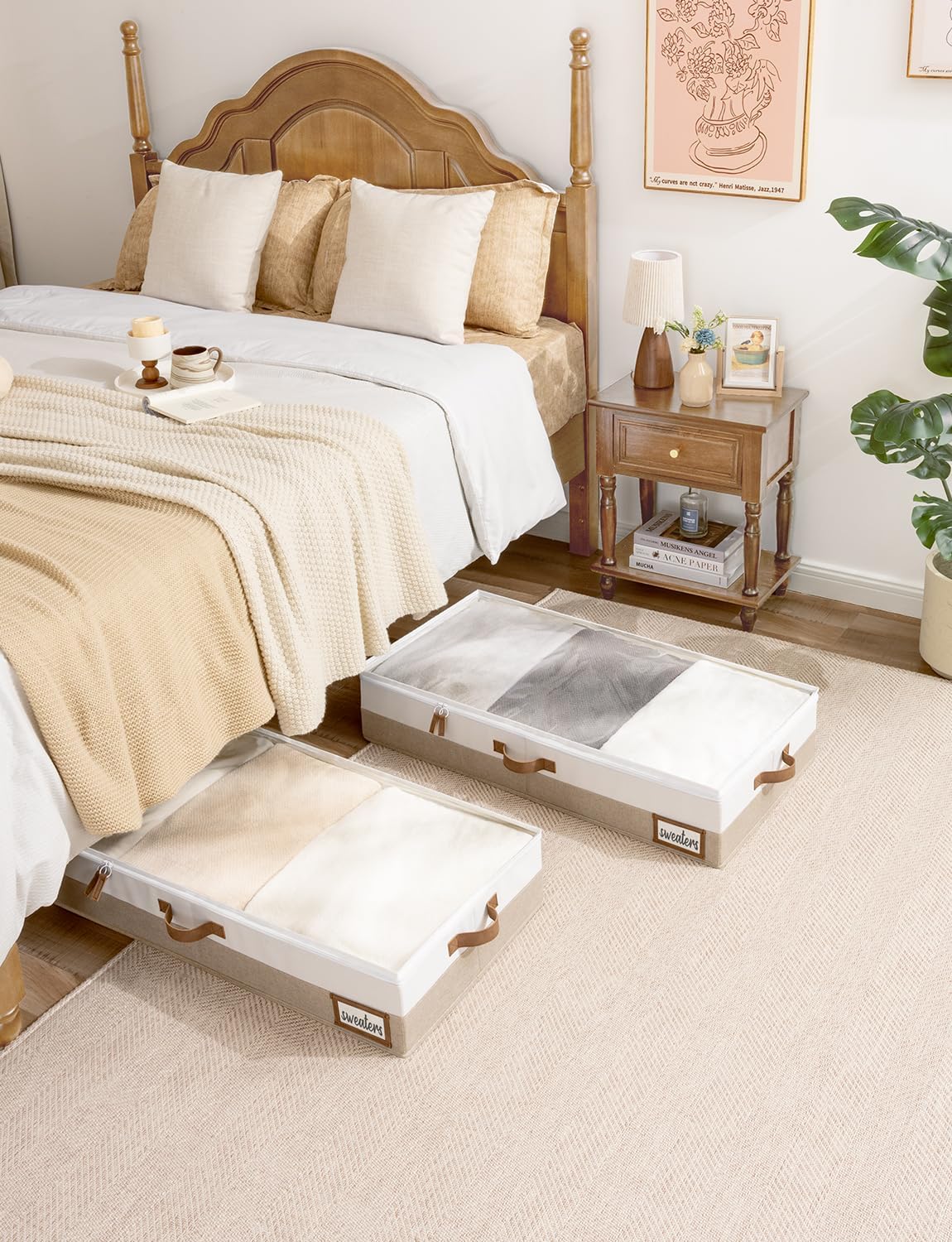 - Underbed storage box featuring thick PU handles on 3 sides for easy accessing, carrying, and retrieving.