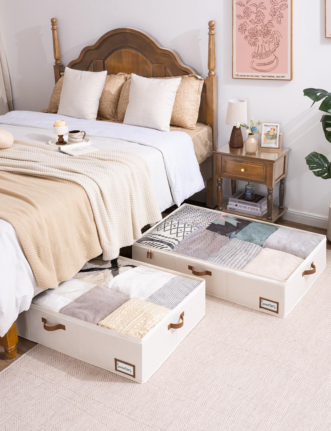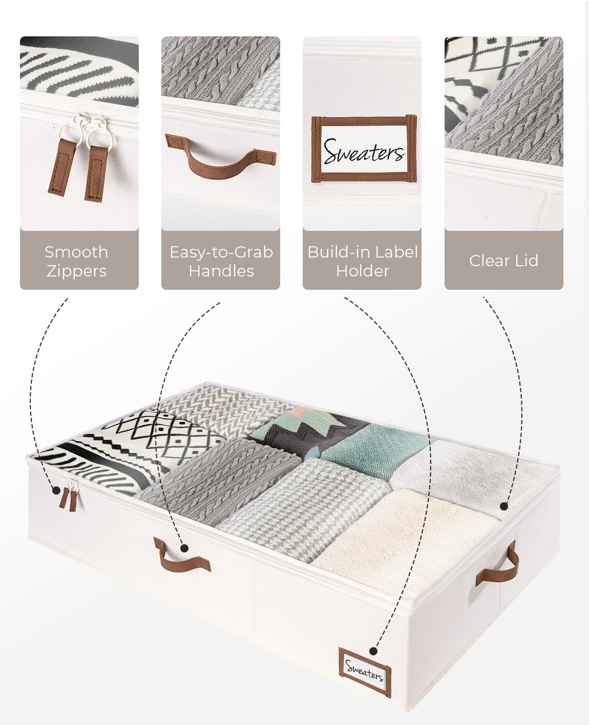 - Underbed storage box featuring thick PU handles on 3 sides for easy accessing, carrying, and retrieving.