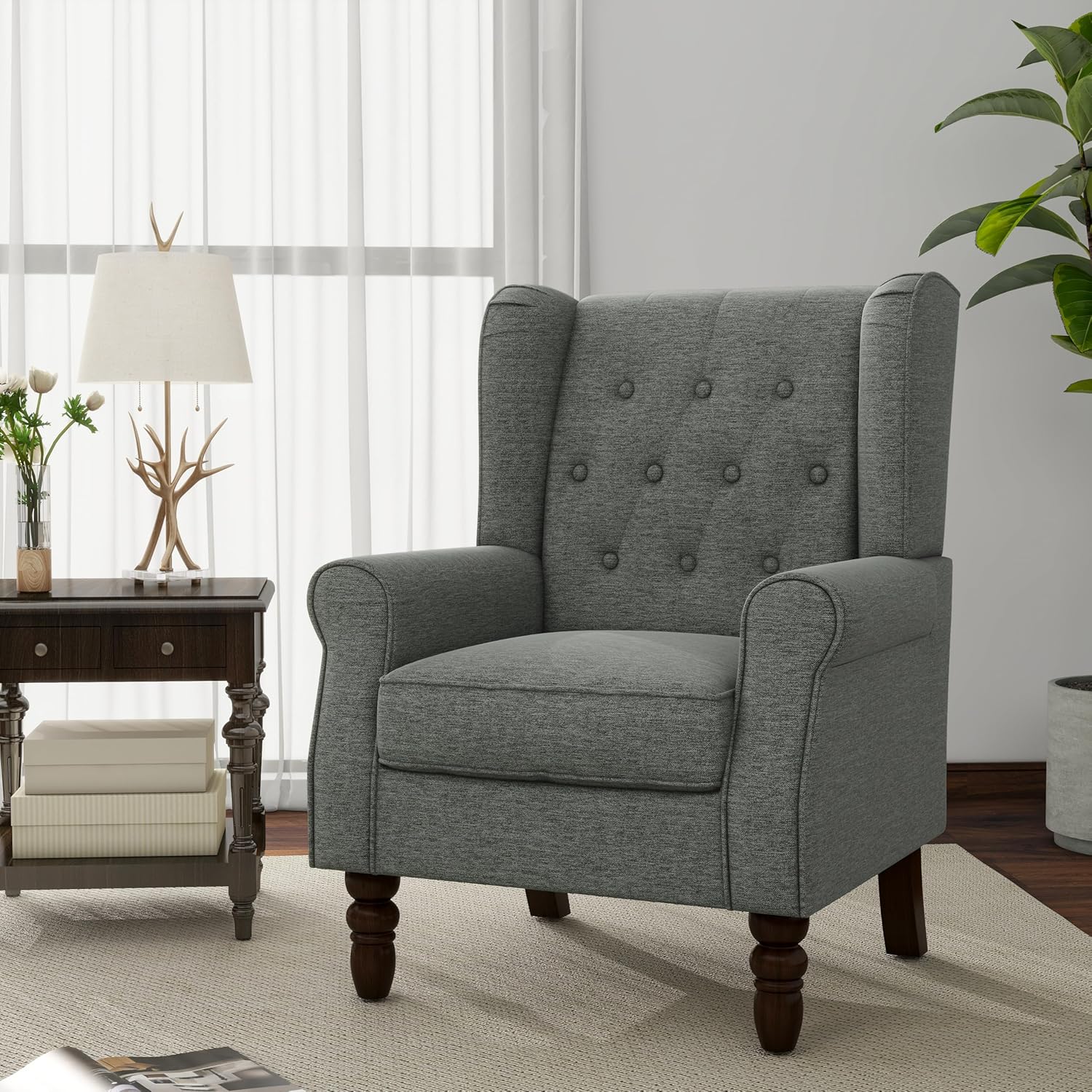 Accent Chair, Upholstered Armchair with Button Tufted High Back & Solid Wood Legs, Comfy Wingback Reading Single Sofa Chair for Small Spaces, Living Room, Bedroom (Grey, Set of 1)