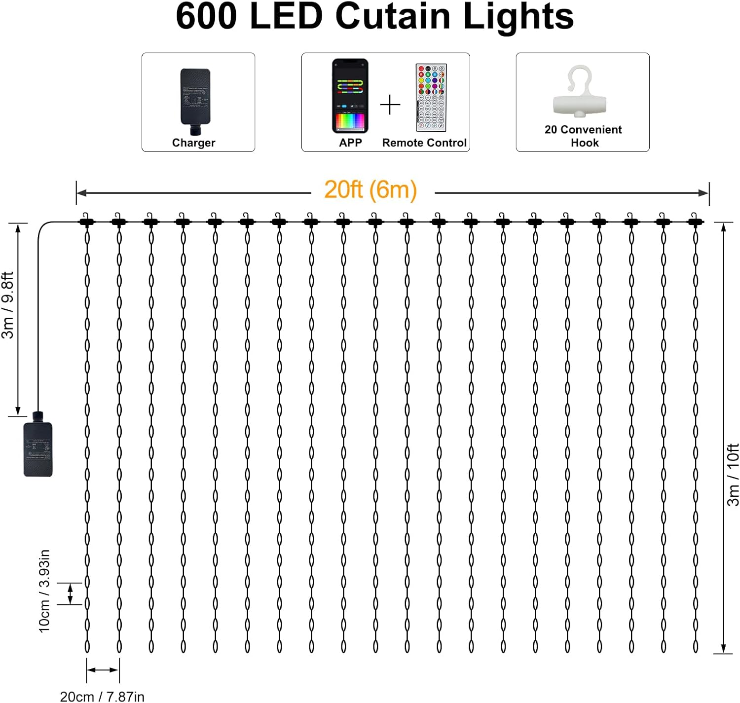 - Extra-Large Lighting Display: Expansive 20ft (length) x 10ft (height) coverage with 600 ultra-bright LEDs, creating a dazzling curtain of light perfect for backyards, weddings, and events