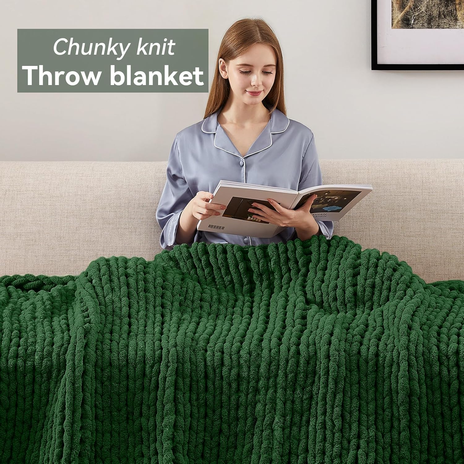 Chunky Knit Throw Blanket, 60''*80'' Knitted Throw Chenille Yarn for Bed Couch, Handmade Grass Green Crochet Big Thick Blanket, Machine Washable Cute Comfy Blanket for Home Decor