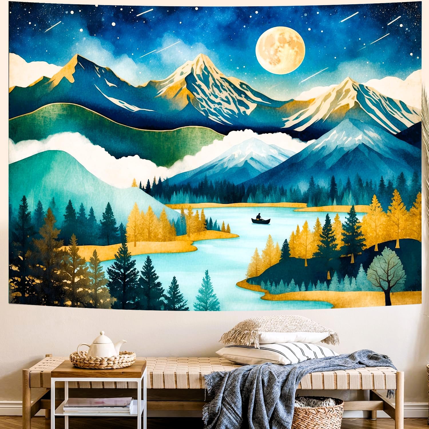 Delur Mountain Tapestry Boho Moon Stars Starry Night Tapestry Wall Hanging Forest Tree Nature Landscape Psychedelic Headboard for Bedroom Living Room Home Decor (70.8" x 92.5")