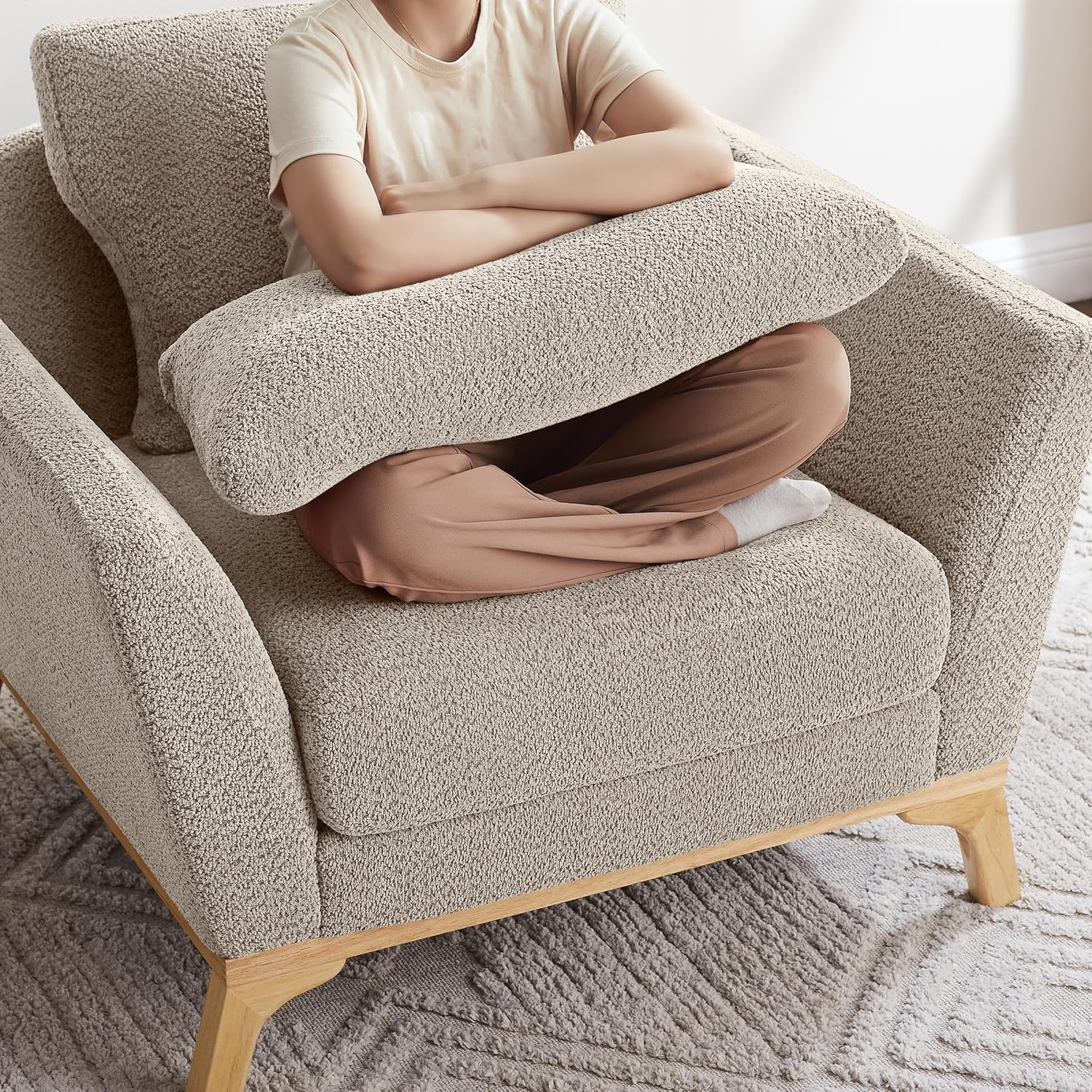 Large-Sized Accent Chair, Thick Cushion Bedroom Reading Chair, Comfortable Living Room Single Sofa, Boucle Camel