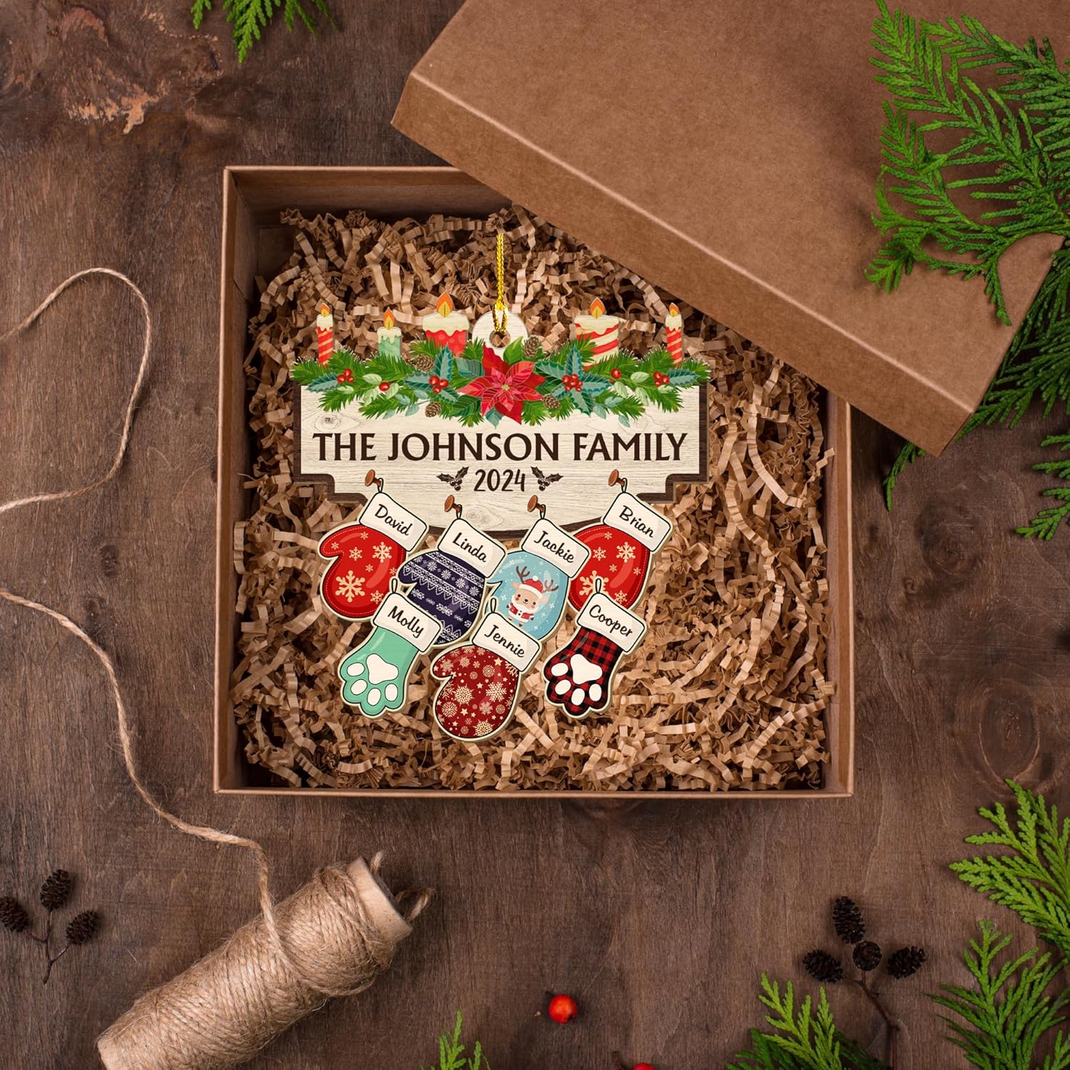 - π Personalized Family Christmas Ornament - Celebrate your unique family this holiday season with the WRAPPINESS Family With Pet Ver 2 Personalized Wood Ornament. Customize each glove with family members' names and add stockings for pets, making it a beautiful and heartwarming addition to your Christmas tree.