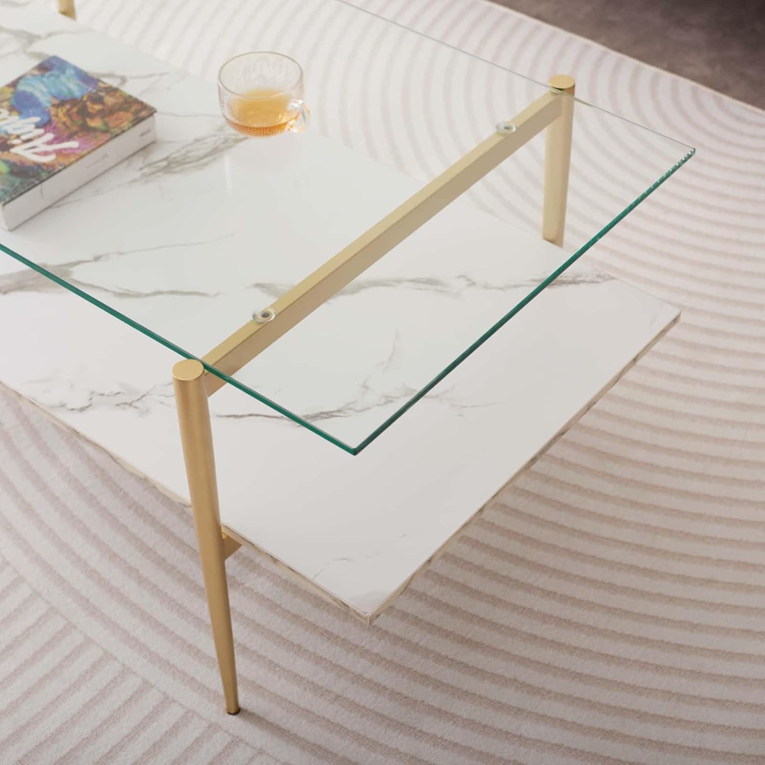 Rectangle Coffee Table for Living Room, Mid-Century Modern Design, L41 x W21 x H17, 2-Tier Structure, Clear Glass Top and White Marble Finish Wood Shelf, Conical Legs with Gold Finish