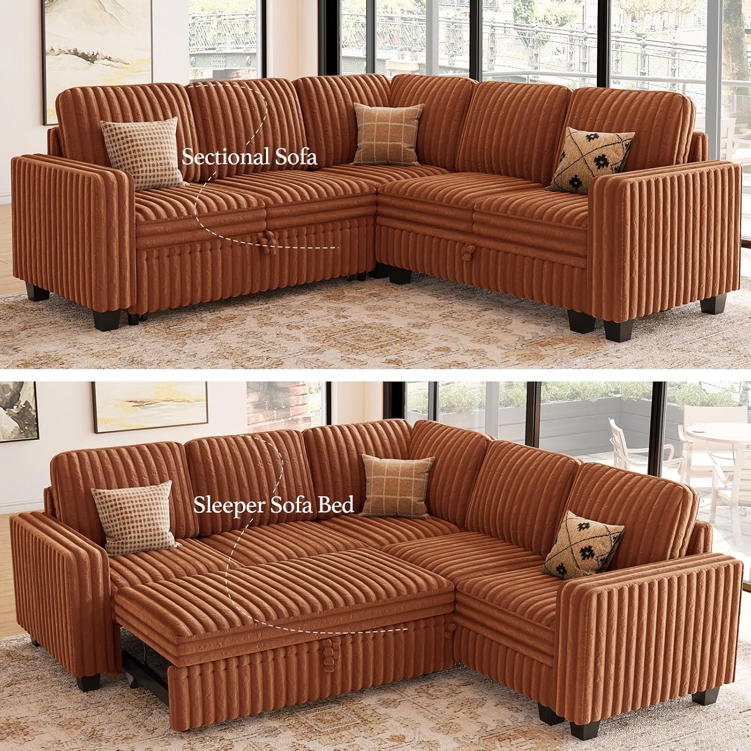 - Easy Assembly: Assembly of this modular sectional pull out sofa is effortless. The corduroy sectional sofa is conveniently packaged in 5 boxes, which may occasionally be delivered on separate days